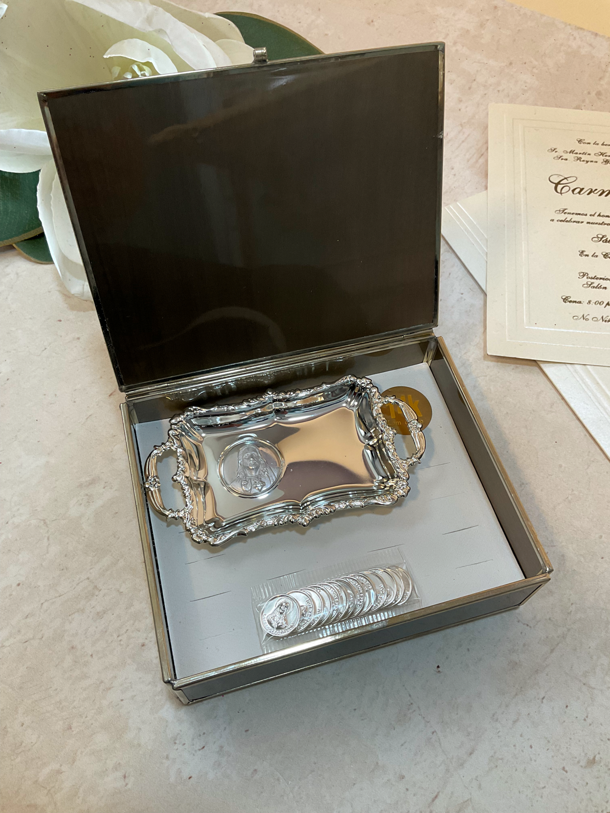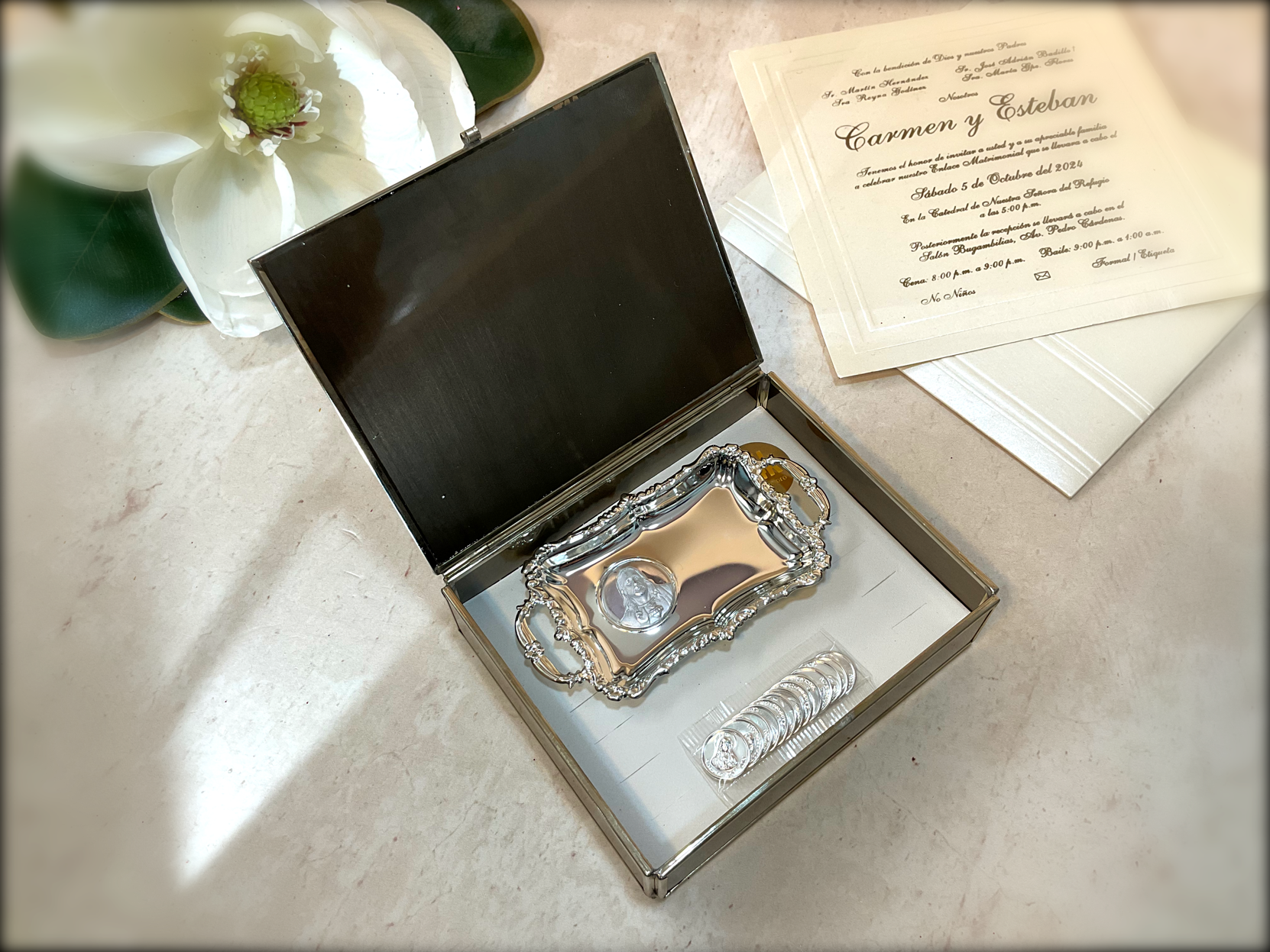 Nuestro set de ARRAS 4238 son el detalle Perfecto para honrar una de las tradiciones más significativas del matrimonio, Este set está elaborado en laminado de oro con arras del sagrado corazón y caja de metal.