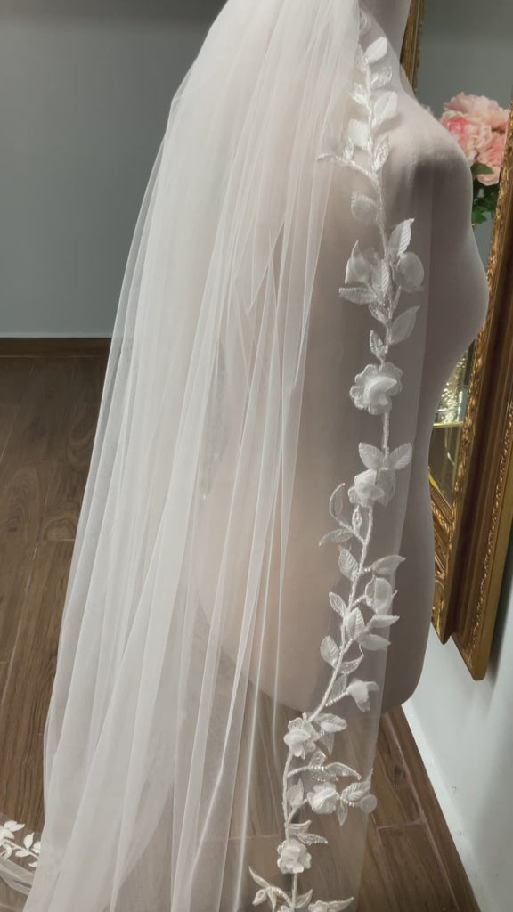 Velo catedral MAEVA está elaborado artesanalmente en tul seda sobre encaje floral bordado.