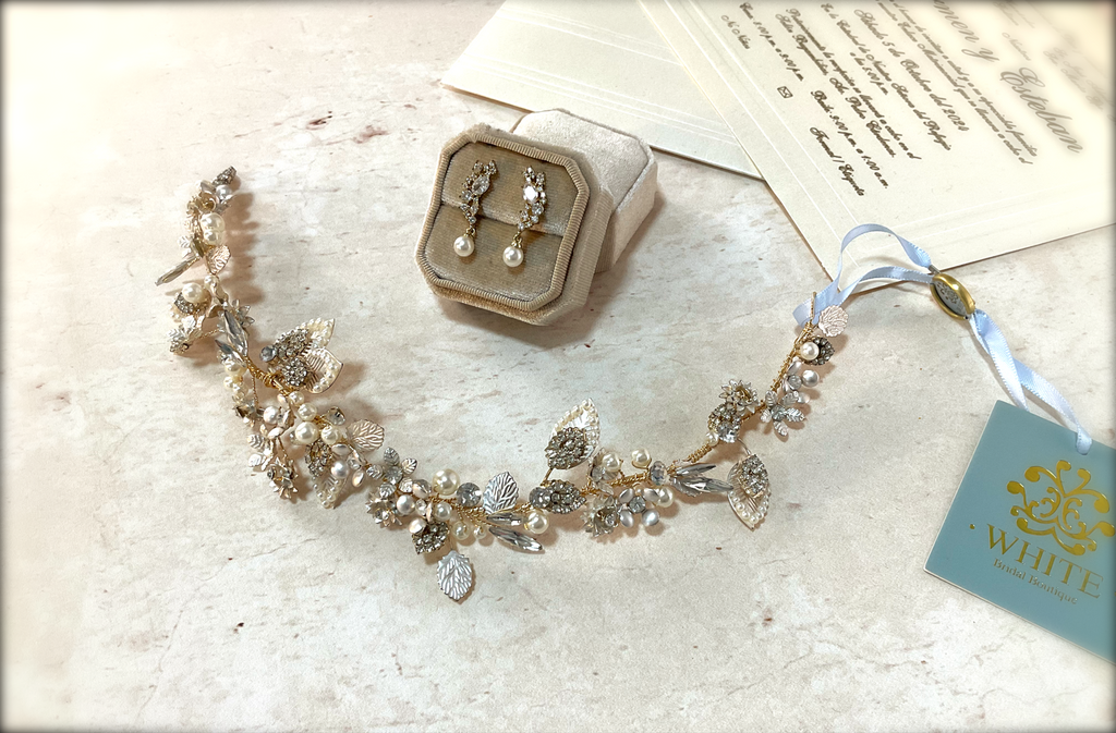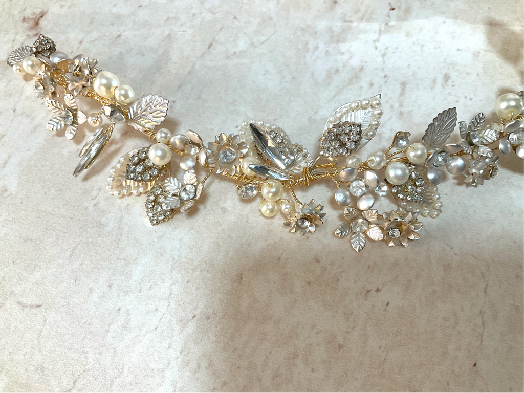 Guía flexible en oro light, está elaborada en delicadas hojas con incrustaciones de cristales y flores. Su delicado diseño brinda un look fresco y romántico.