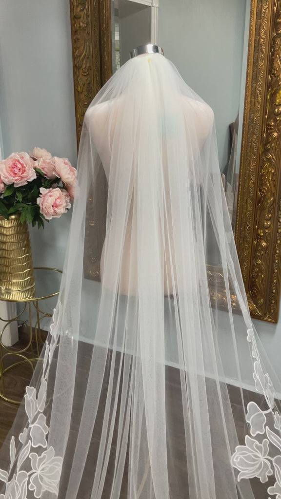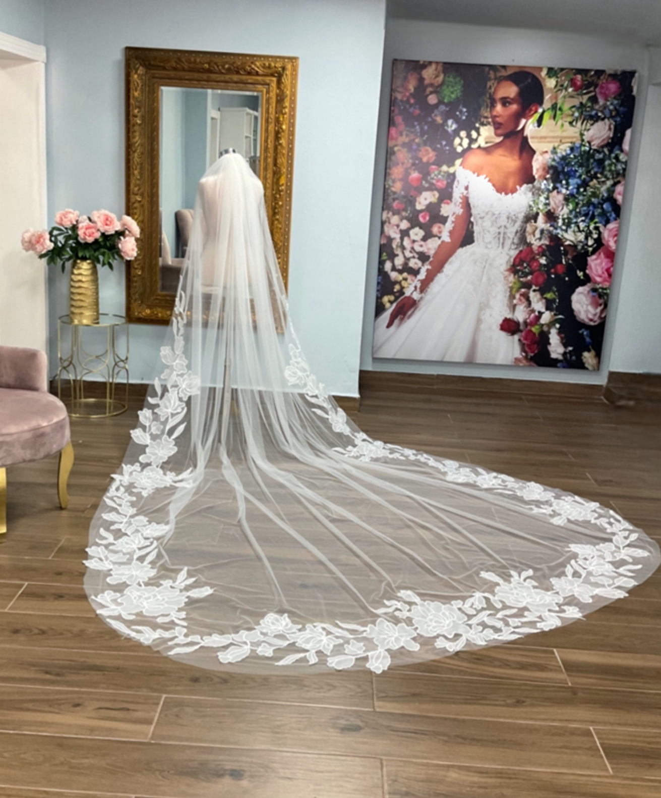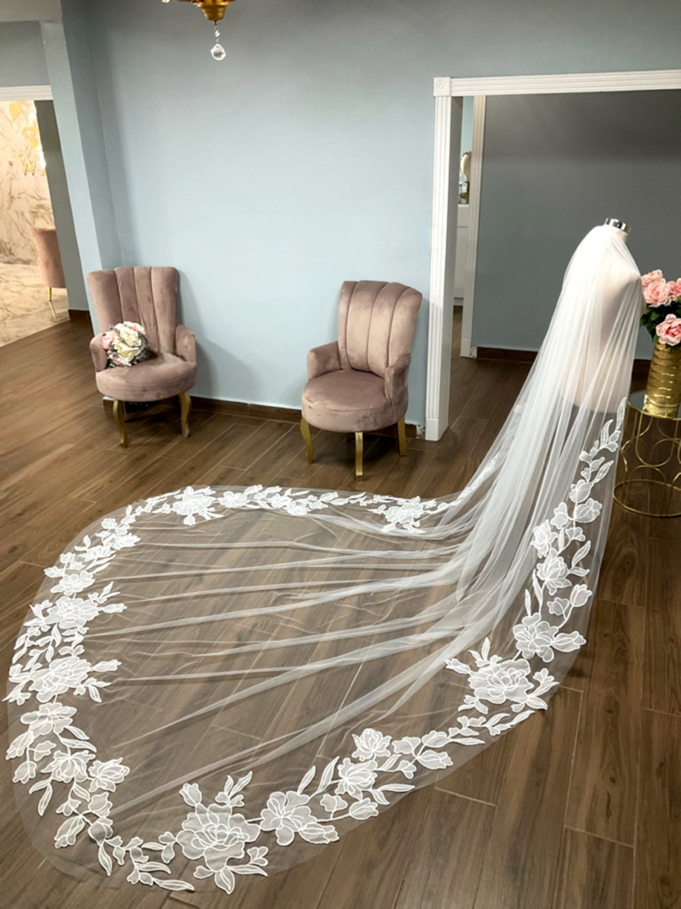 El complemento perfecto para tu vestido de novia es nuestro velo catedral FAILY está elaborado artesanalmente en tul seda sobre encaje floral relieve.