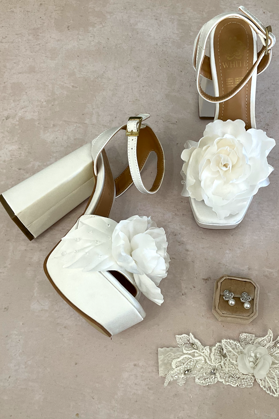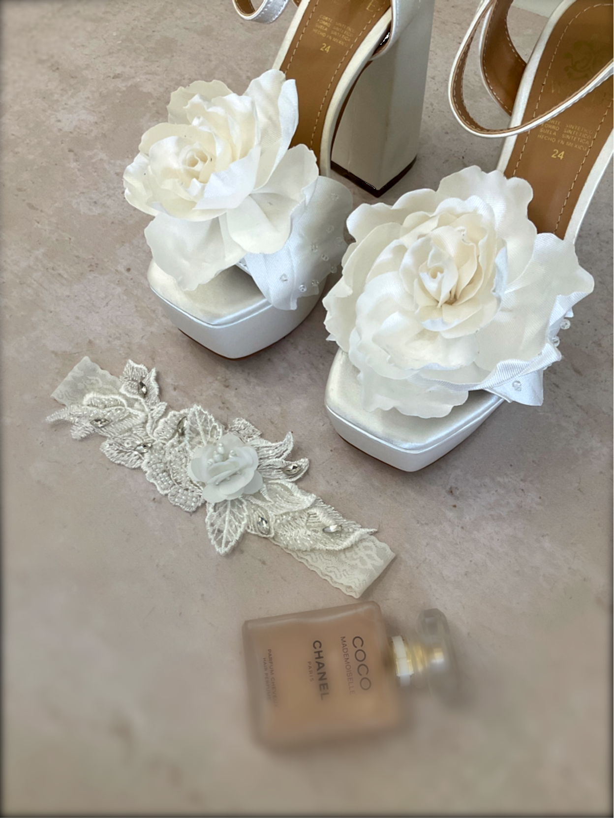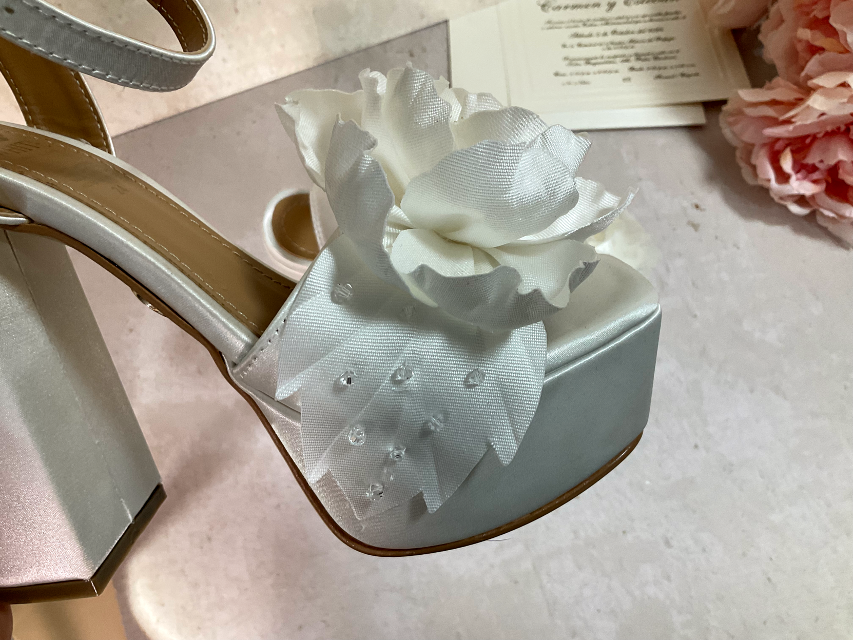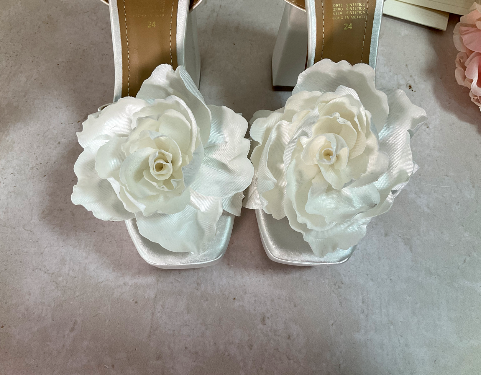 Están elaboradas en delicado Shantung ivory, punta cuadrada abierta con una decoración de flor hecha a mano con hojas incrustaciones de cristal austriaco.