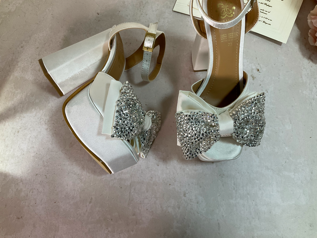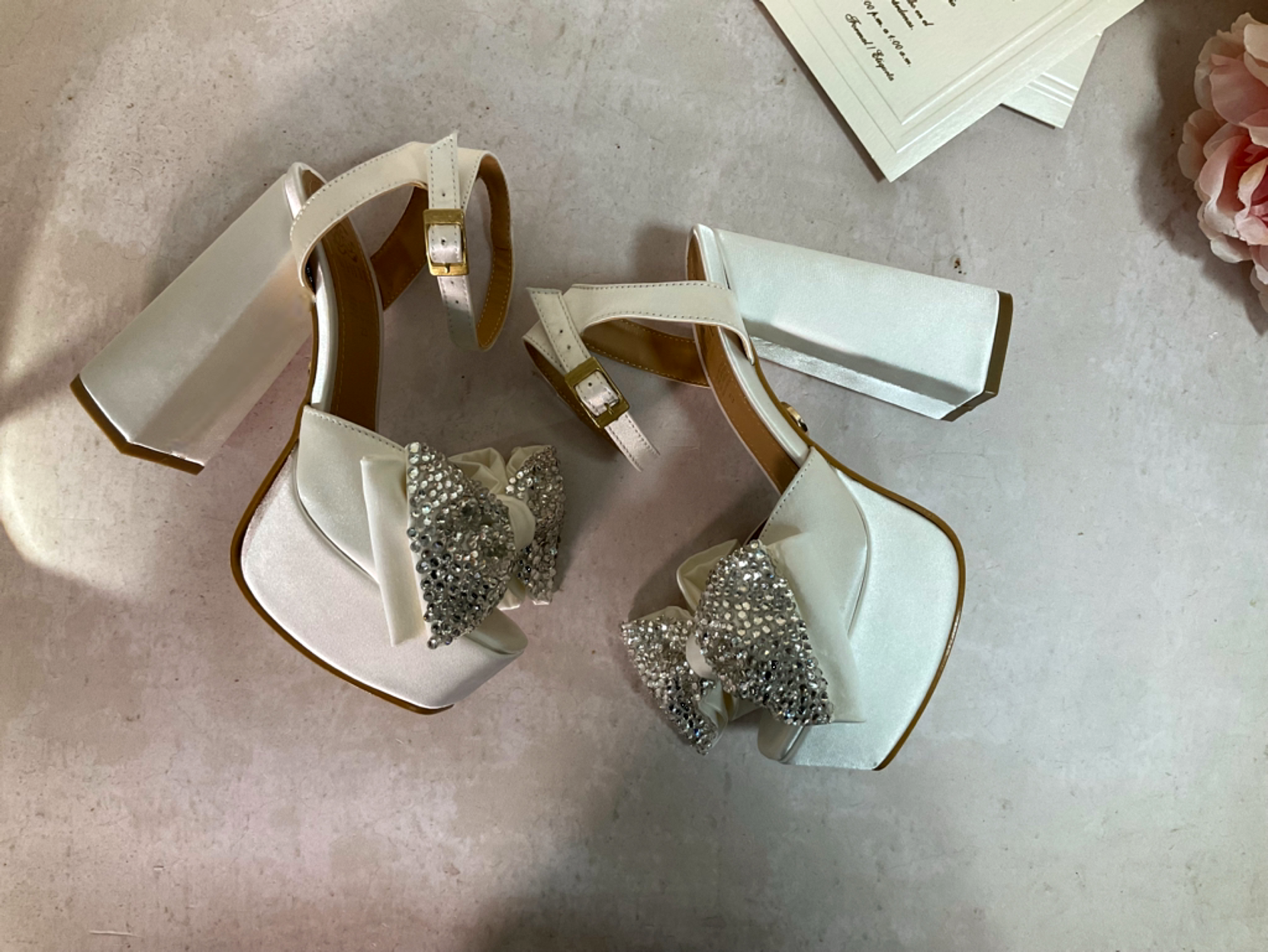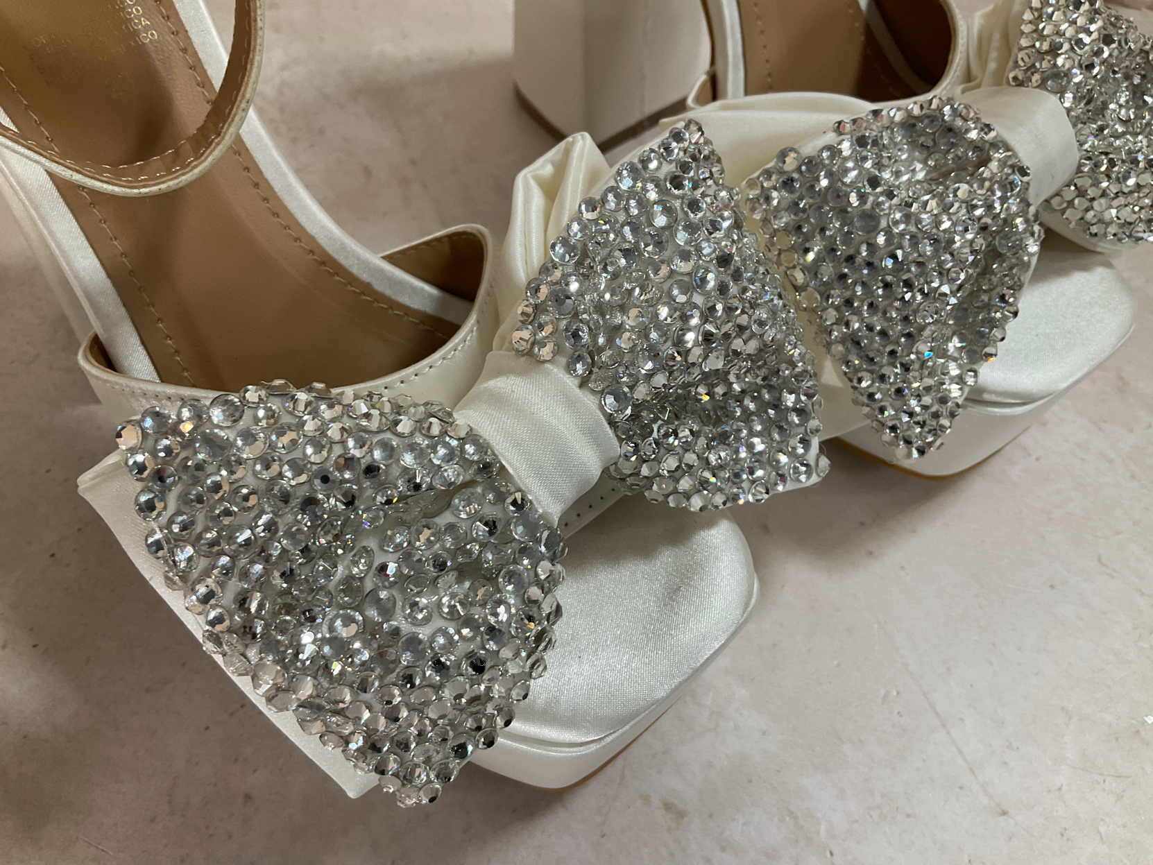 Zapatillas STELLA, en shantung Ivory, con una decoración en moño con incrustaciones de cristales, con punta abierta cuadrada y pulsera tobillo para mayor seguridad.