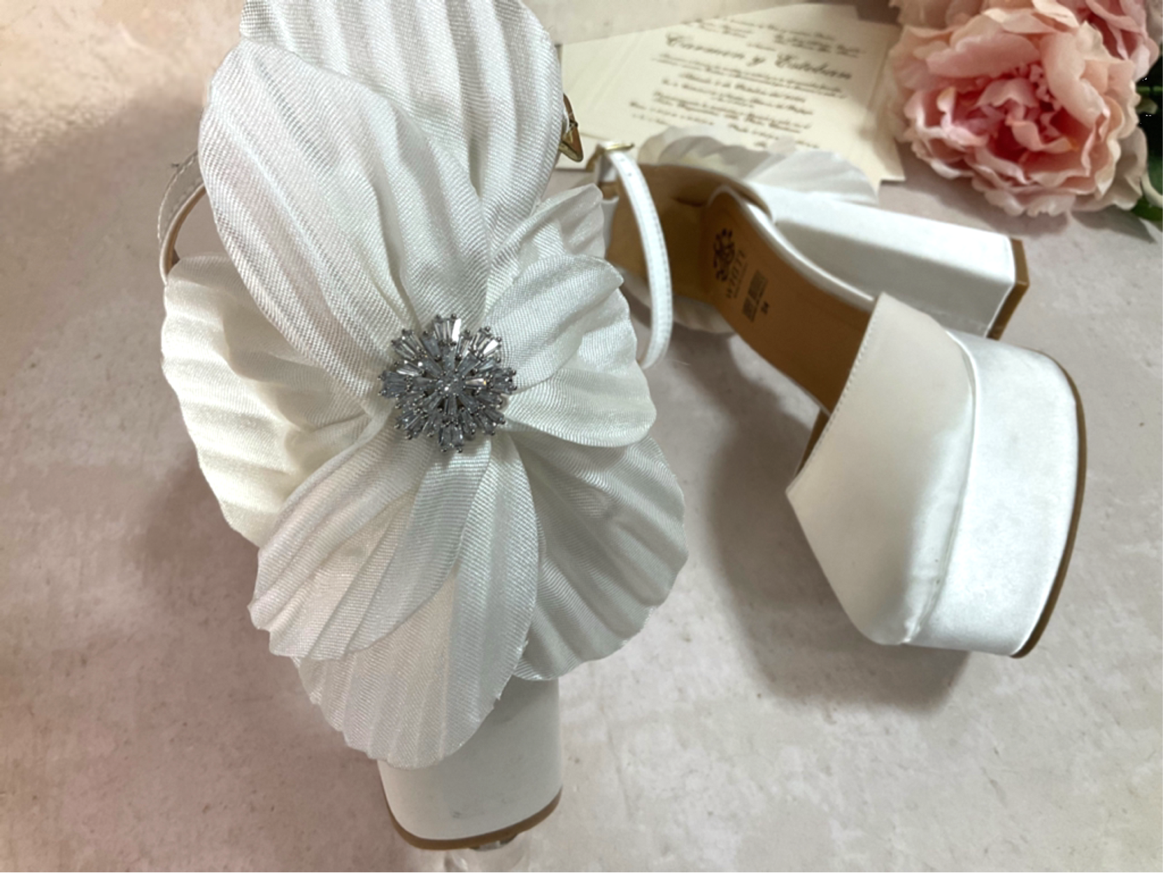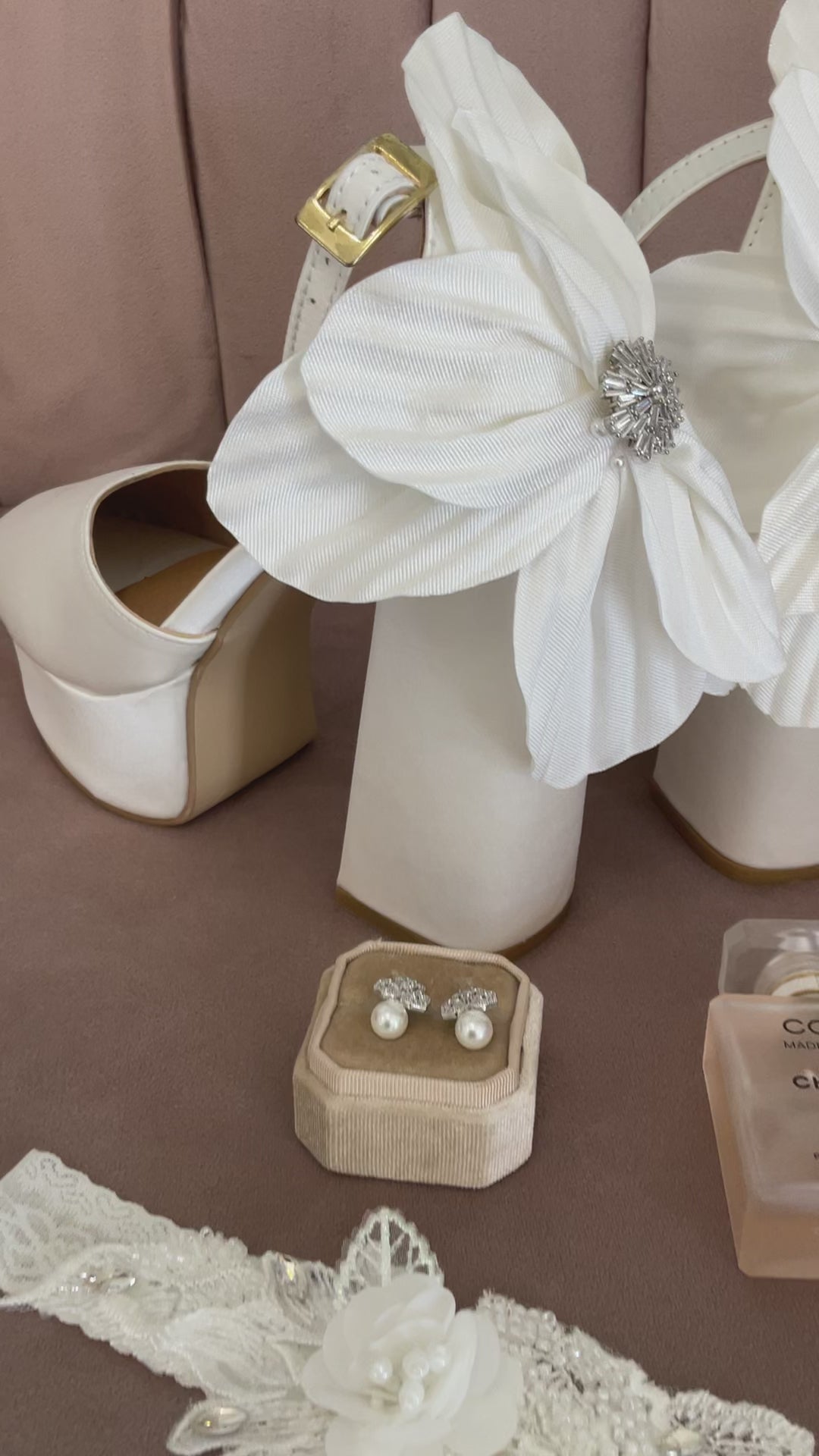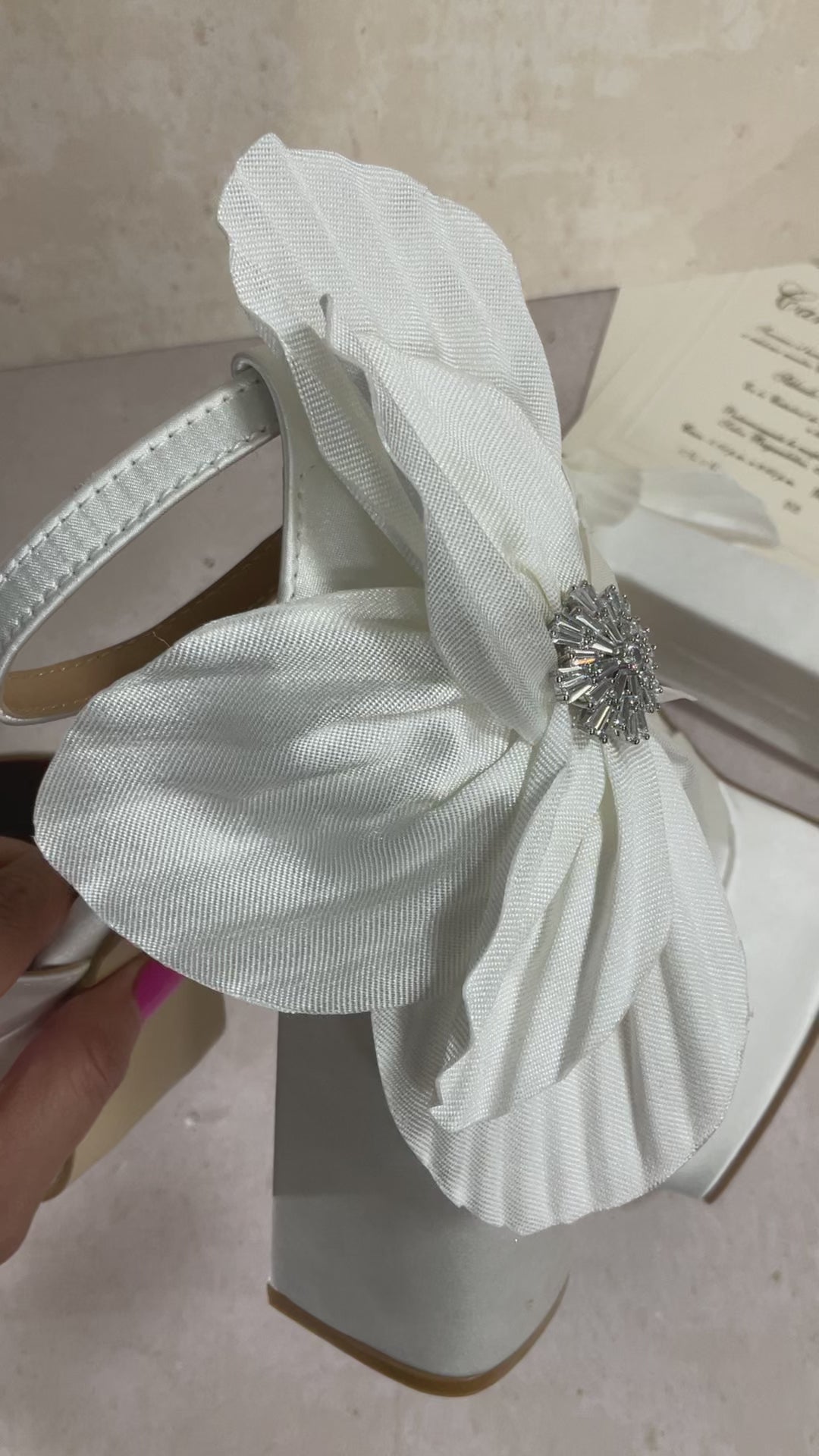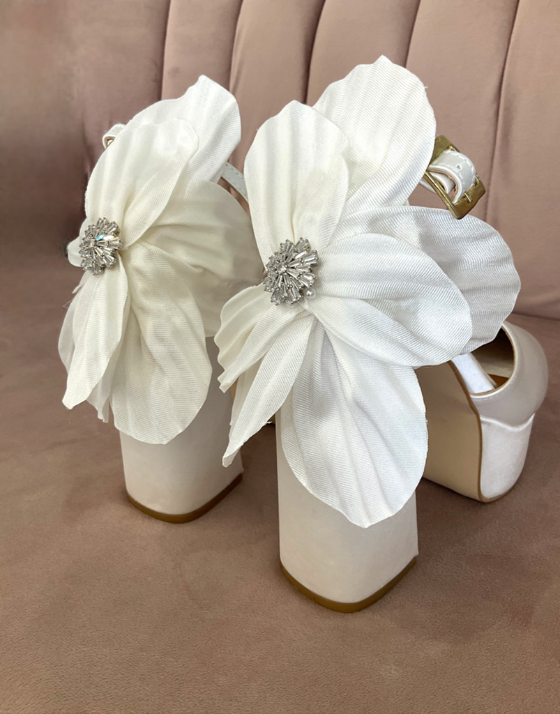 Zapatillas VICTORIA, en shantung ivory, con punta cerrada con una decoración en flor en mikado hecha artesanalmente con el centro en cristal.