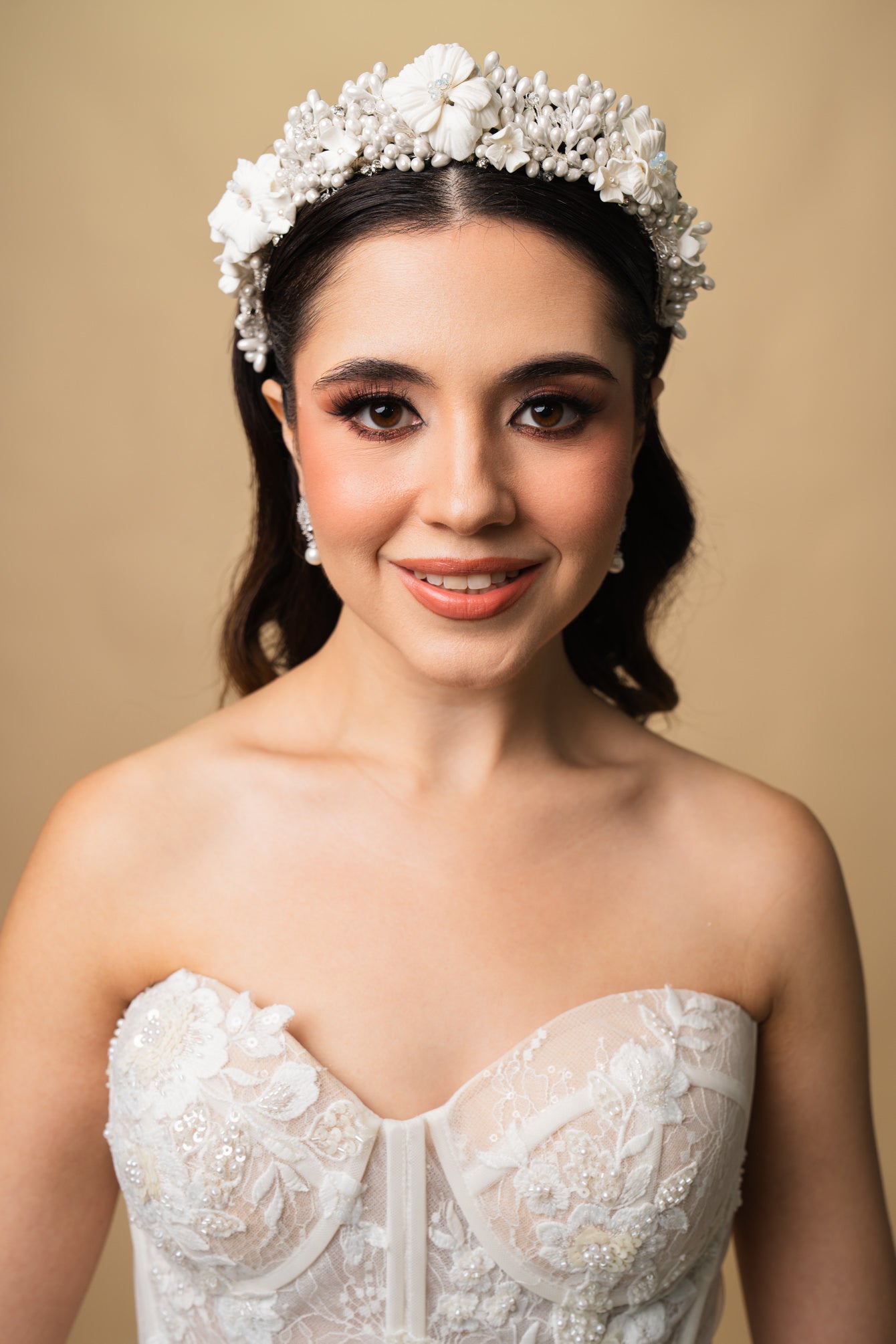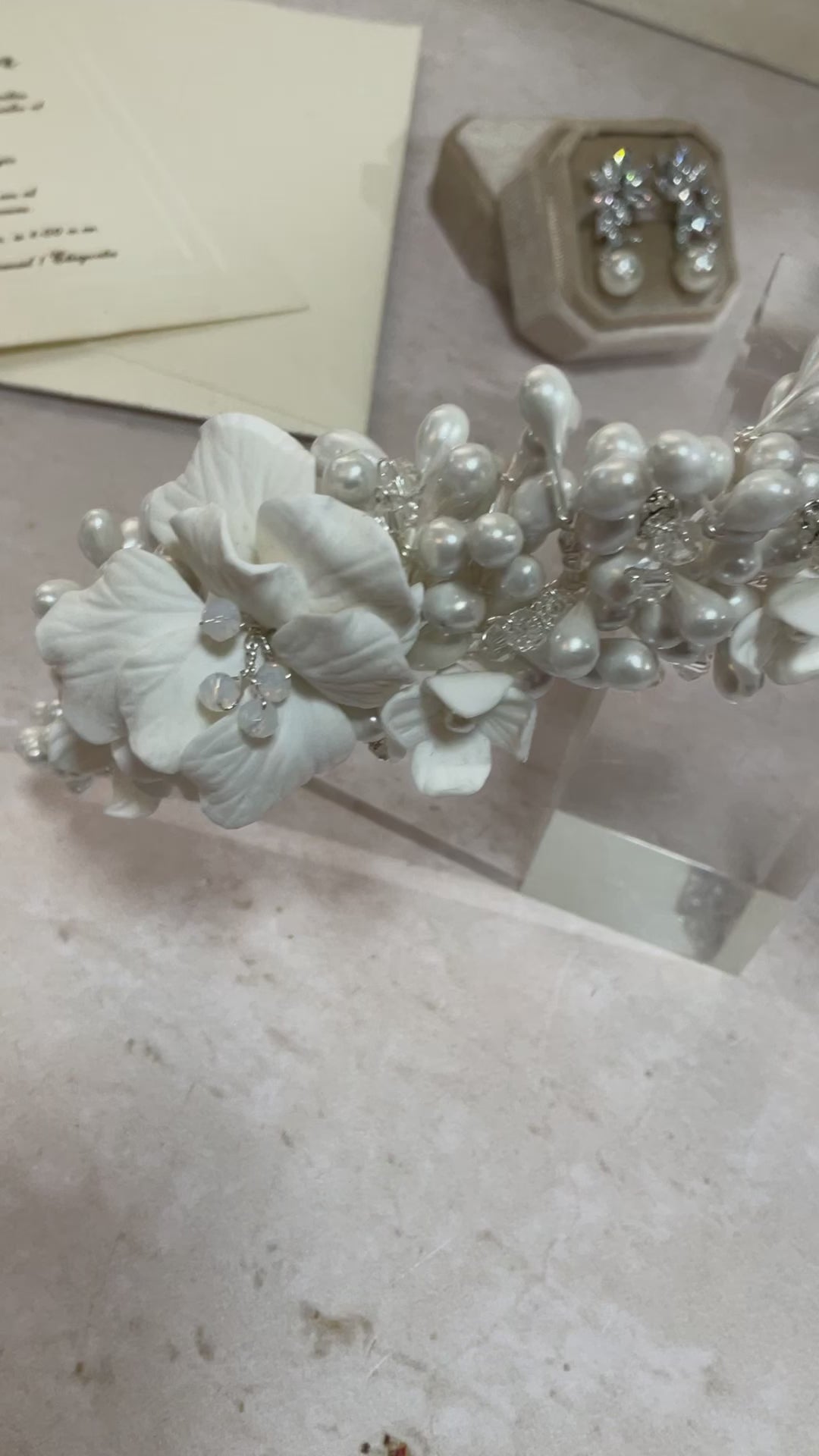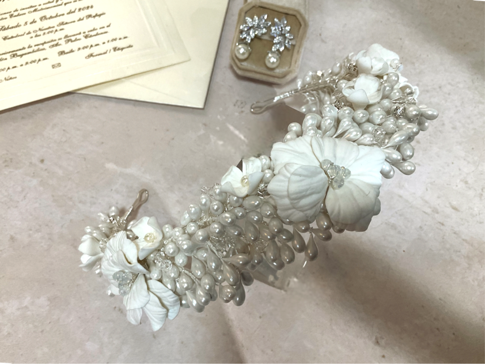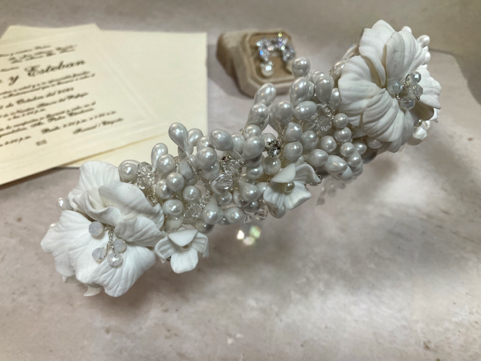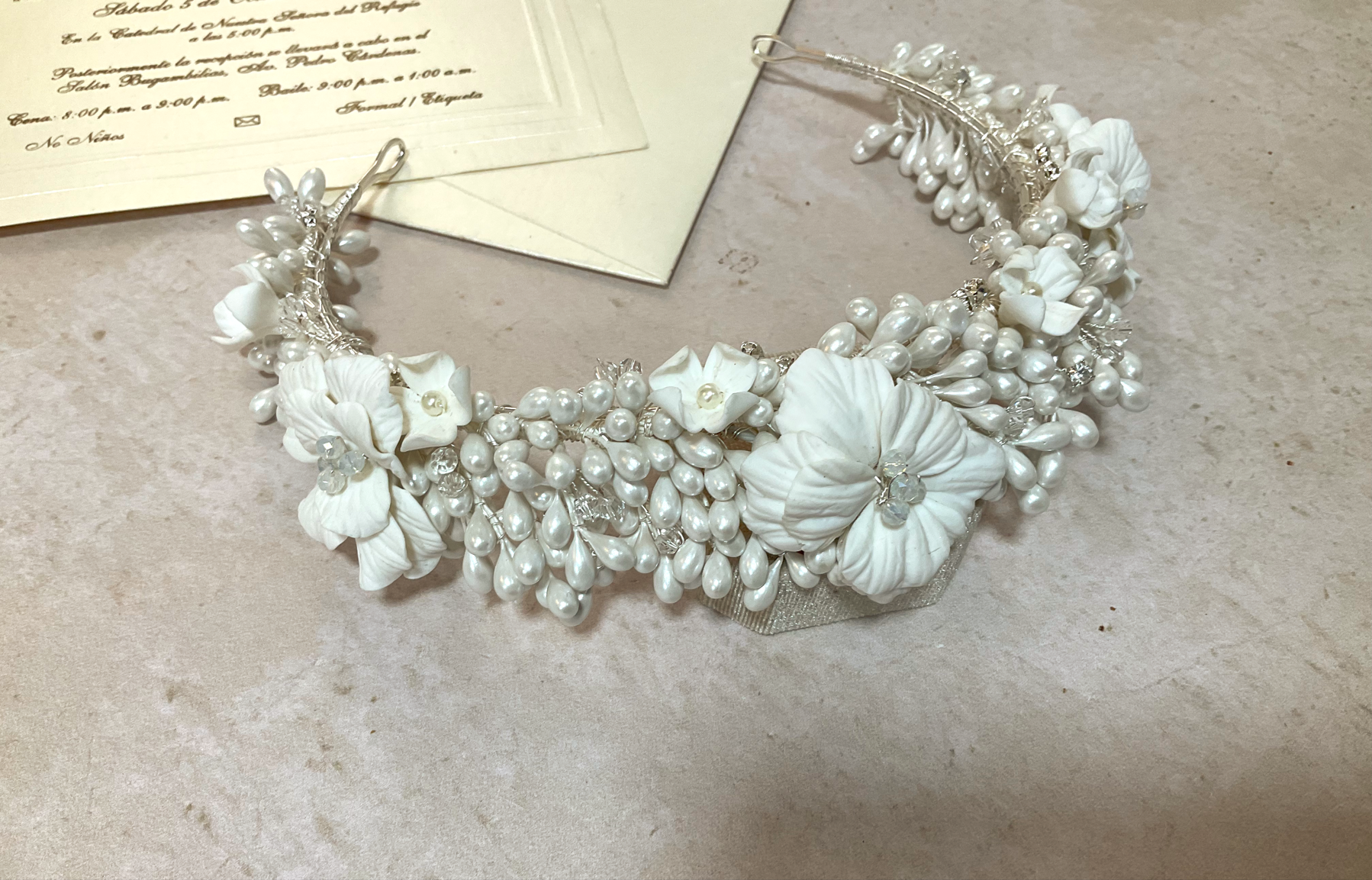 Exquisita tiara hecha a mano con flores porcelana francesa y azahares,diseñada para brindar un look espectacular! Una pieza atemporal que eleva el look nupcial con distinción y glamour.