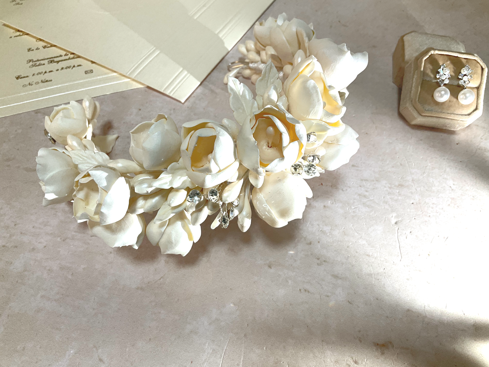 | MATERIAL | flores pasta francesa, azahares, cristal austriaco. |