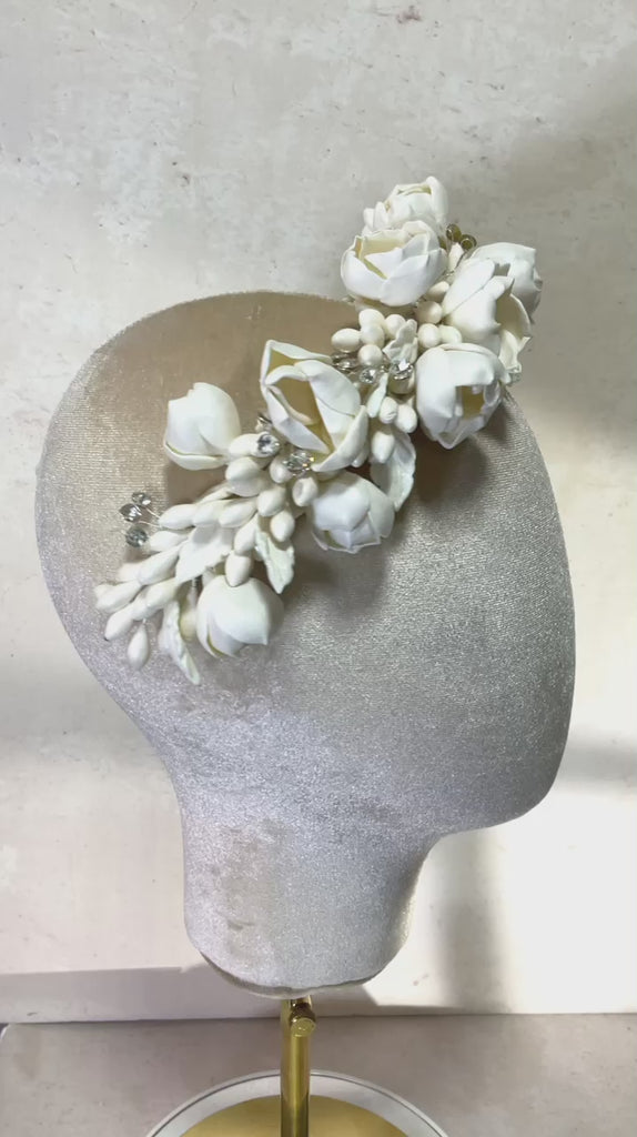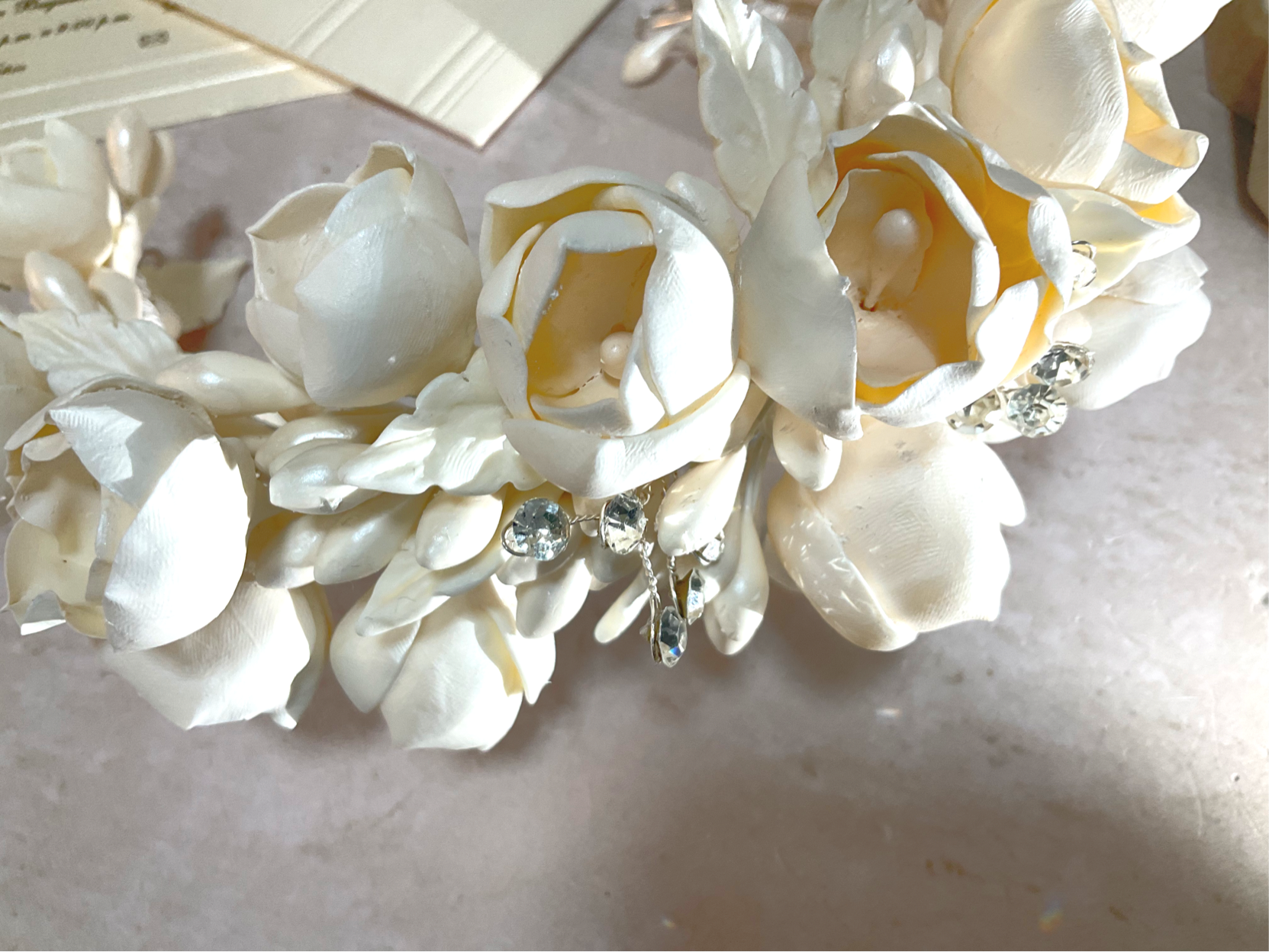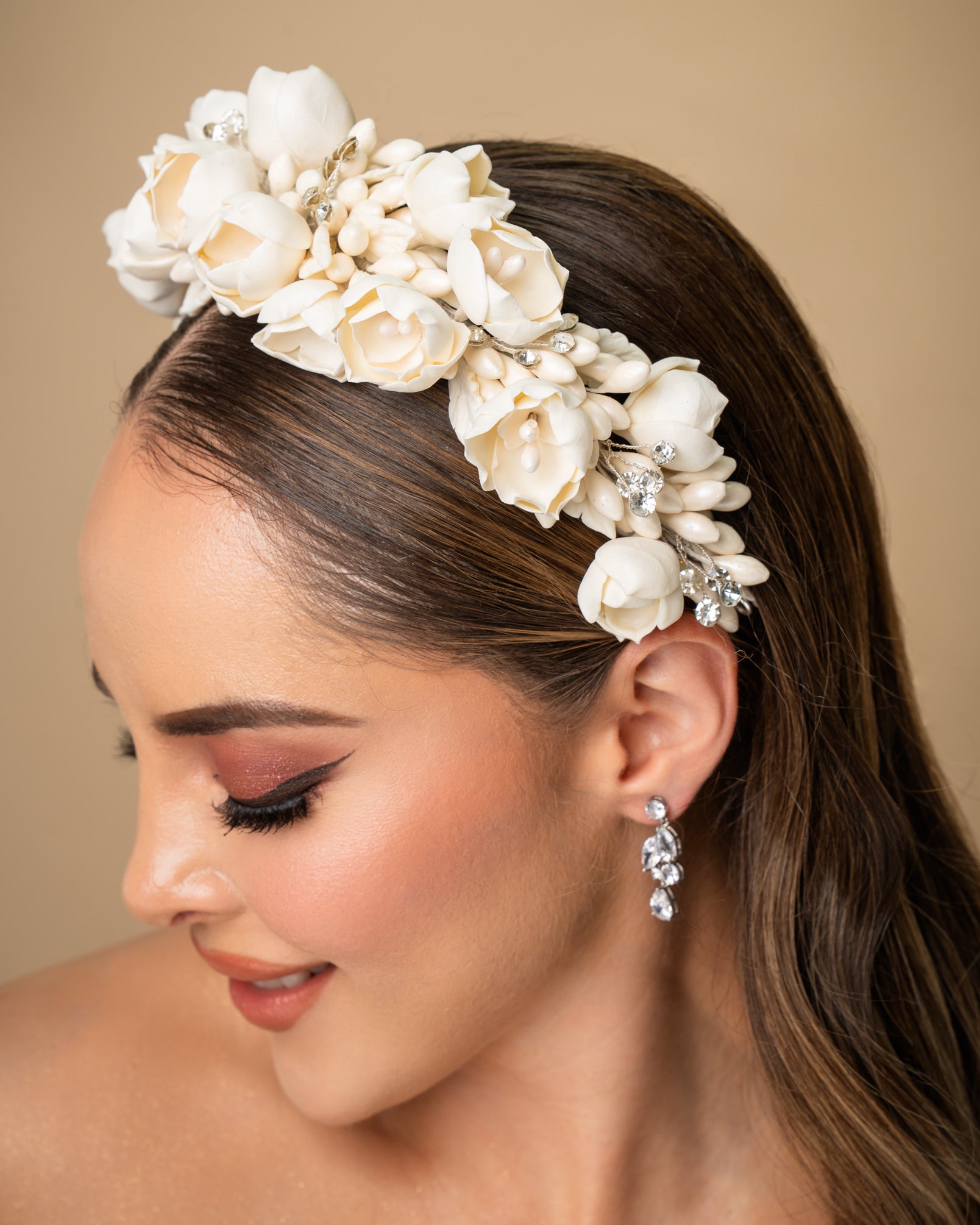 Elaborada artesanalmente en flores de pasta francesa y azahares con un toque de cristales austriacos.