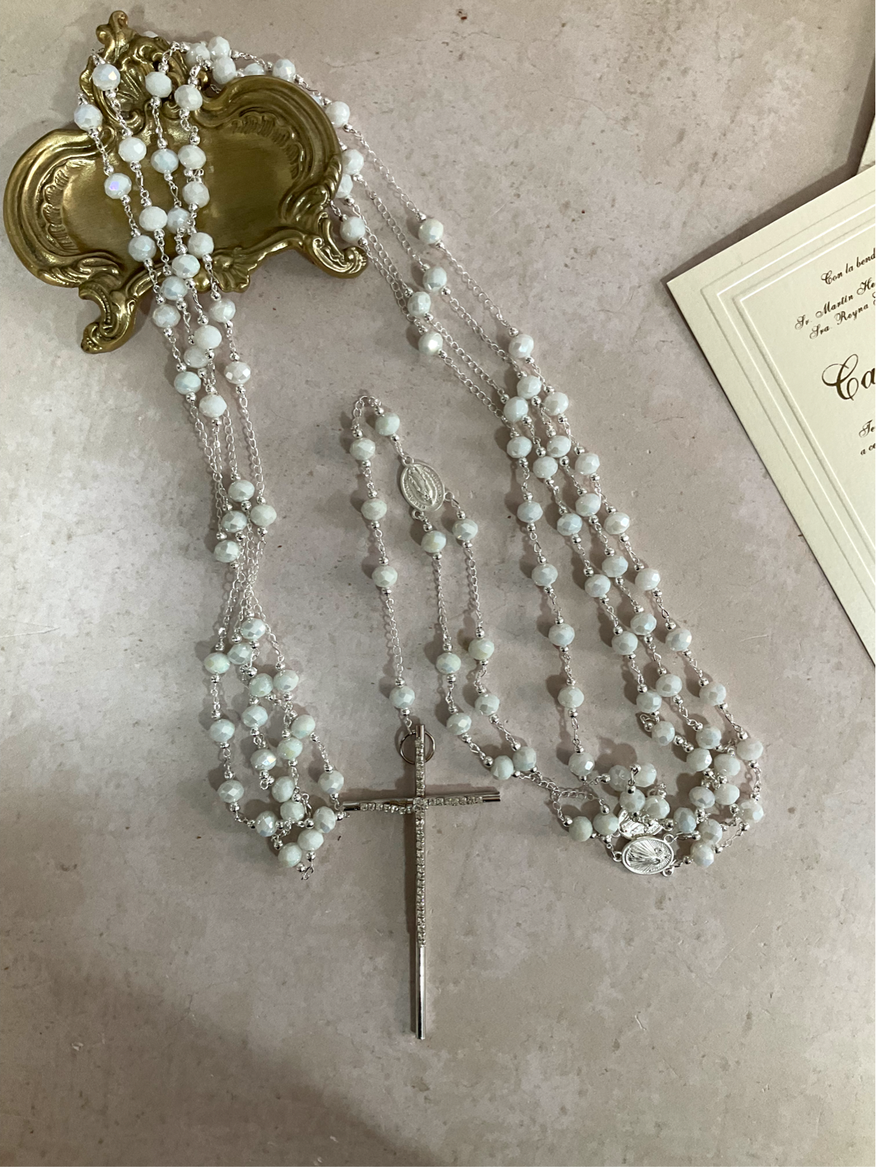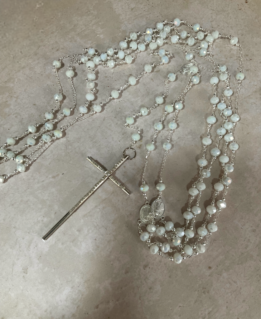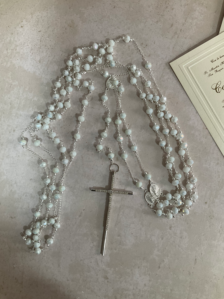 Lazo en cristal austriaco color blanco aperlado,en baño Plata y medalla de virgen de Guadalupe,con una cruz con incrustaciones de cristales.