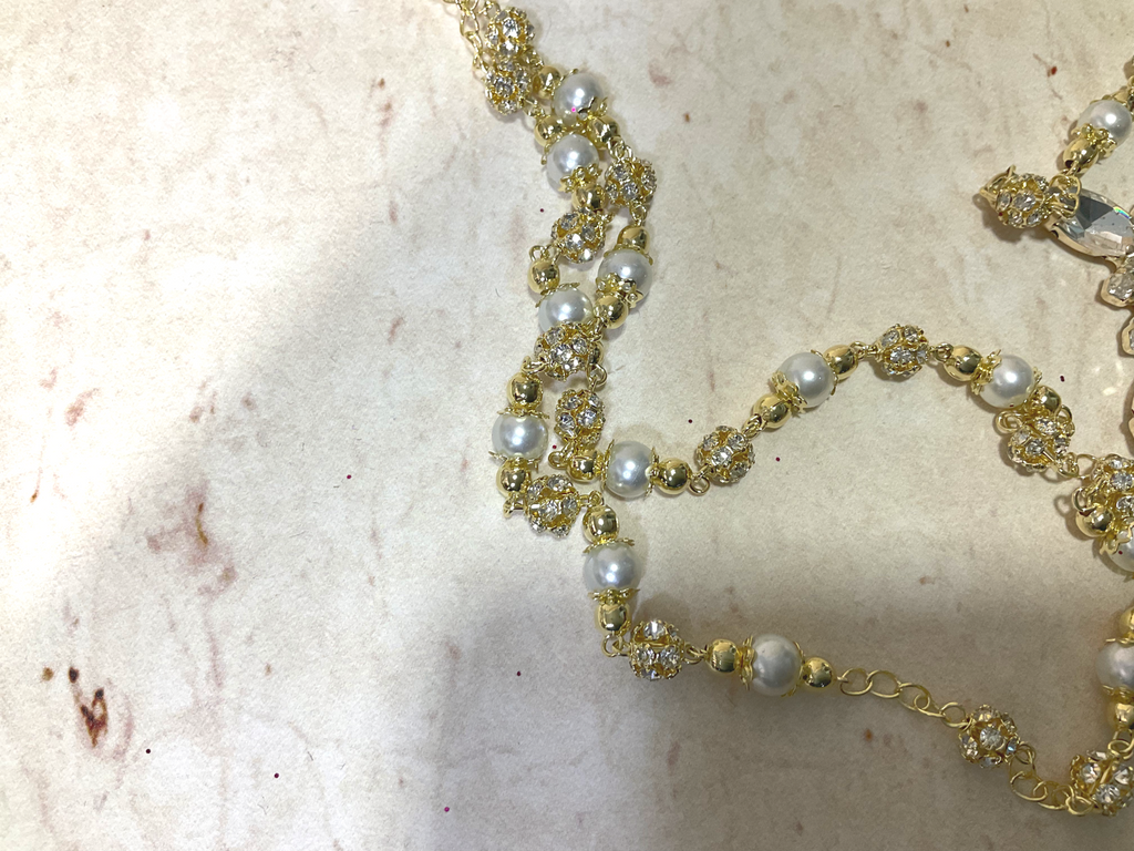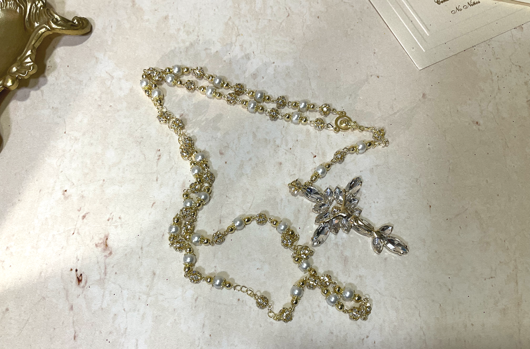 Rosario GRETA con baño en oro, elaborado con cuencas con incrustaciones de cristal y perlas, cruz en cristales navete.