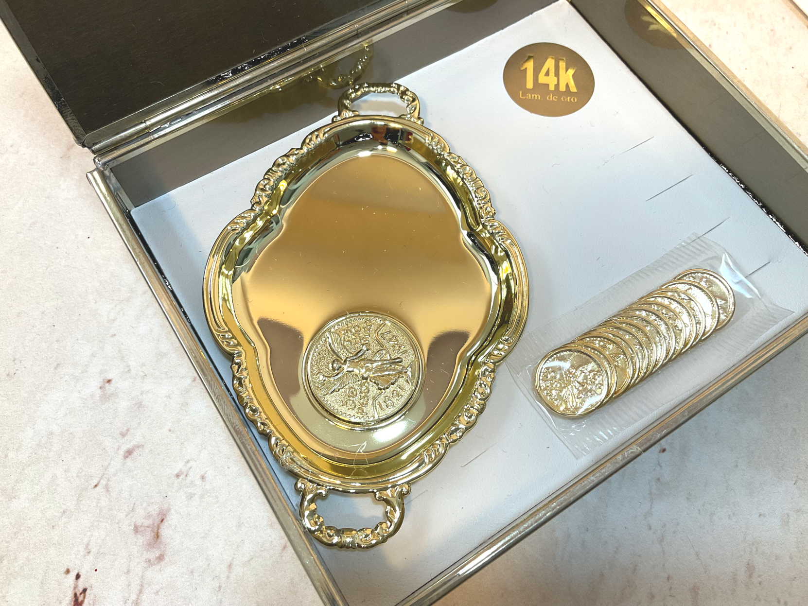 Celebra tu historia de amor con nuestro set de arras 4237 laminadas en oro de 14k. Es una hermosa opción para tu ceremonia religiosa. Incluye caja metálica, charola y arras centenarias.