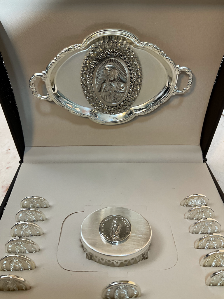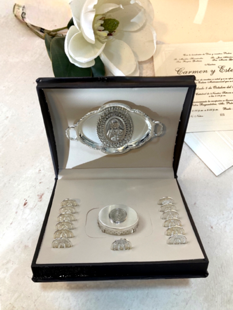 Hermoso set en arras Virgen María, con baño en plata, simbolizan la prosperidad y abundancia que acompaña el inicio de la unión matrimonial, elaboradas cuidadosamente con materiales de alta calidad, son el detalle perfecto para tu enlace!