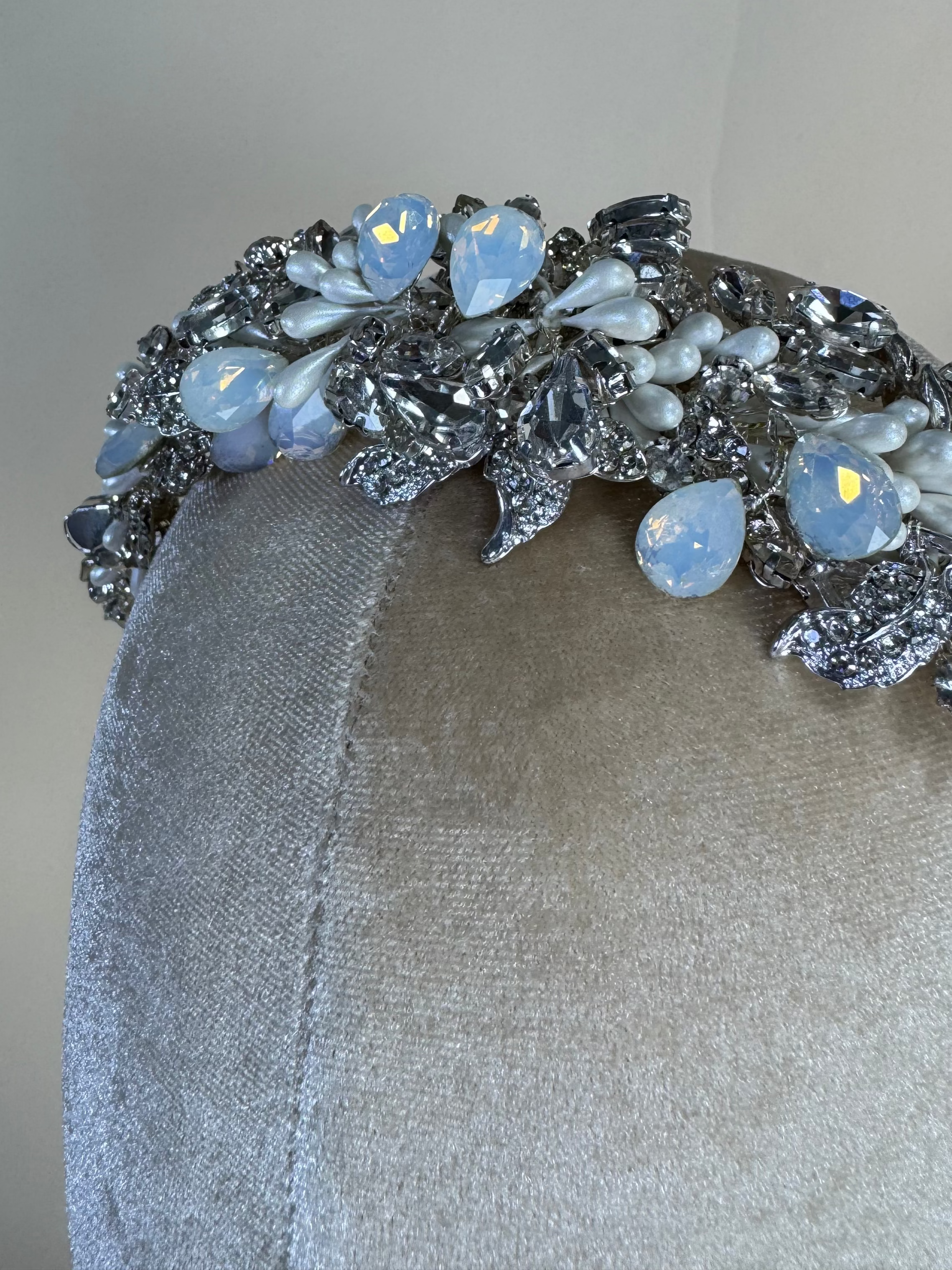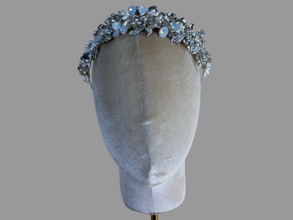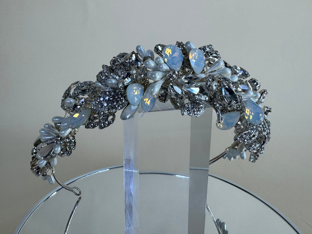 Tiara Bloved-25 Elaborada artesanalmente en porcelana y azahares con una exquisita combinación de Ópalo, perlas de rio y cristal navette.