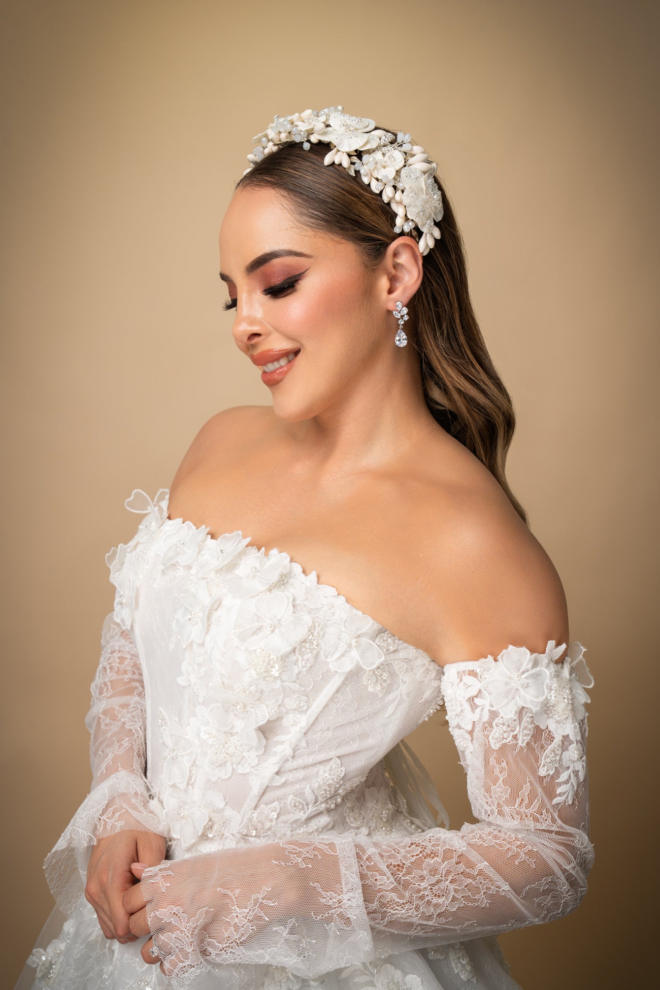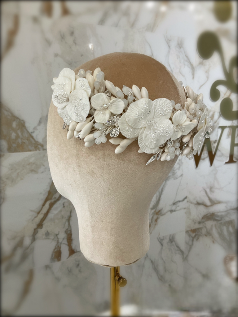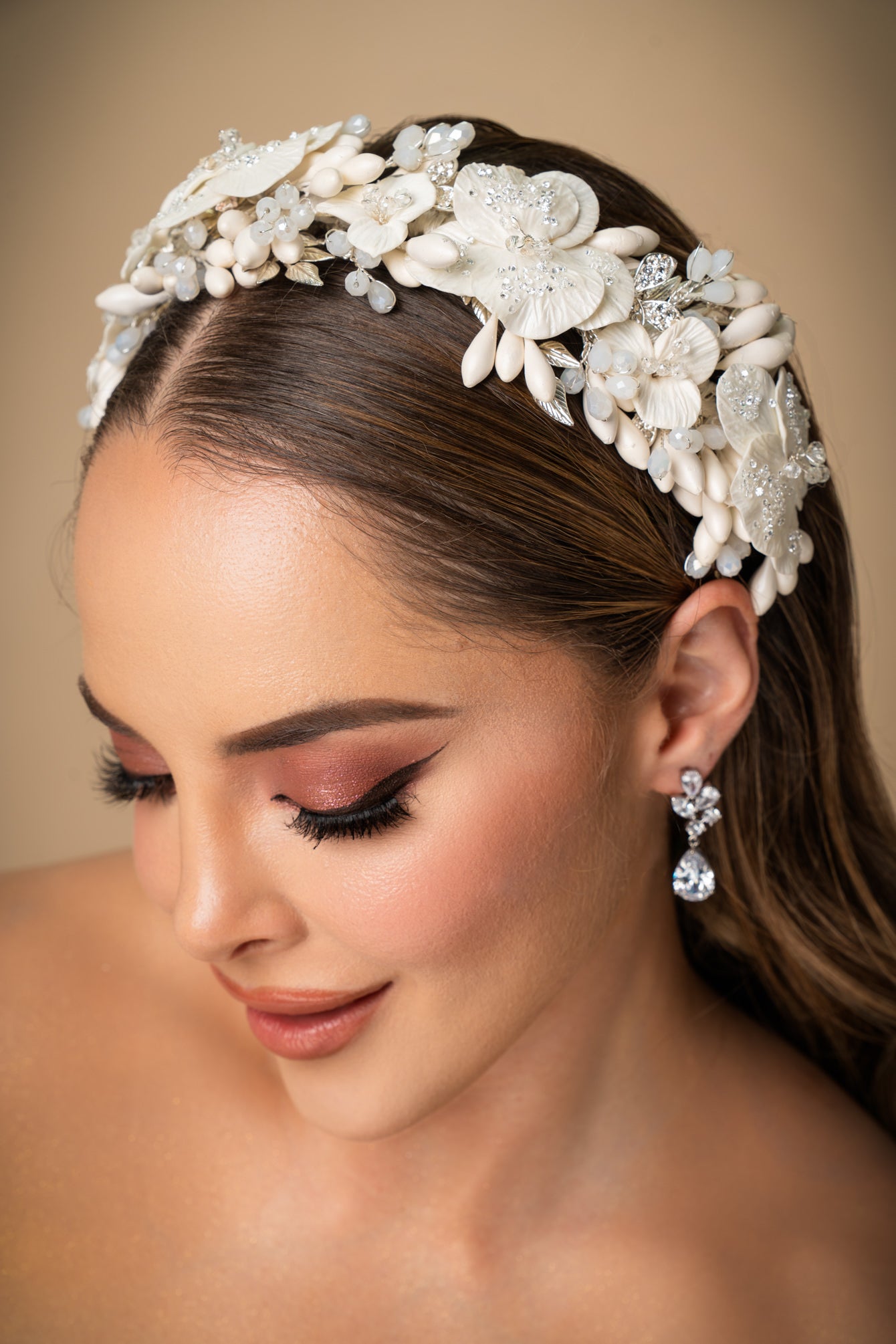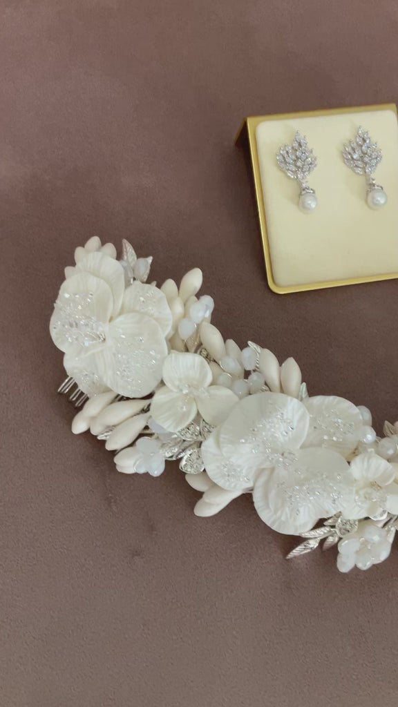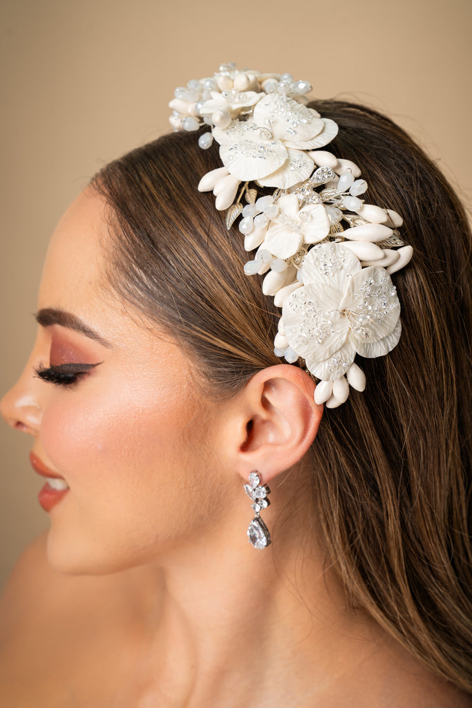 Tocado BLOVED-57 Elaborado en flores de porcelana y azahares con una combinacion de ópalo y hojas silver.