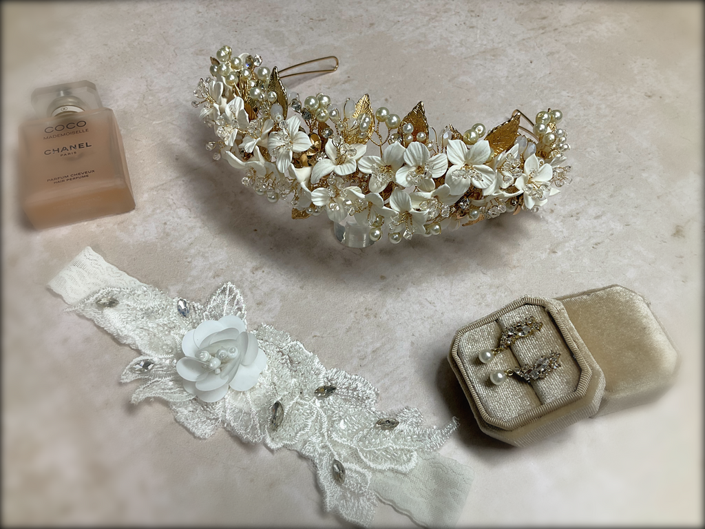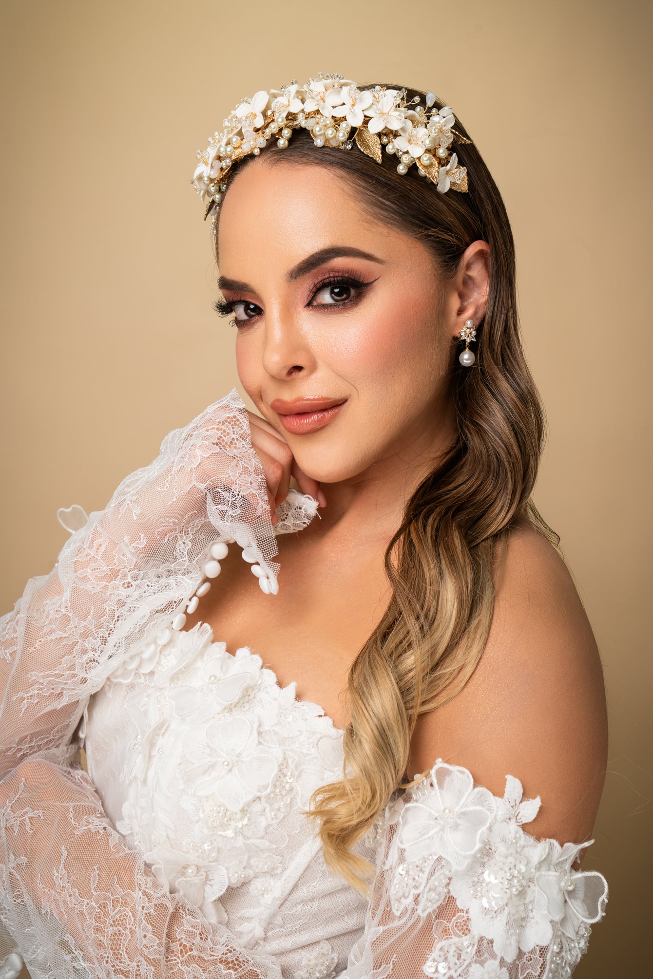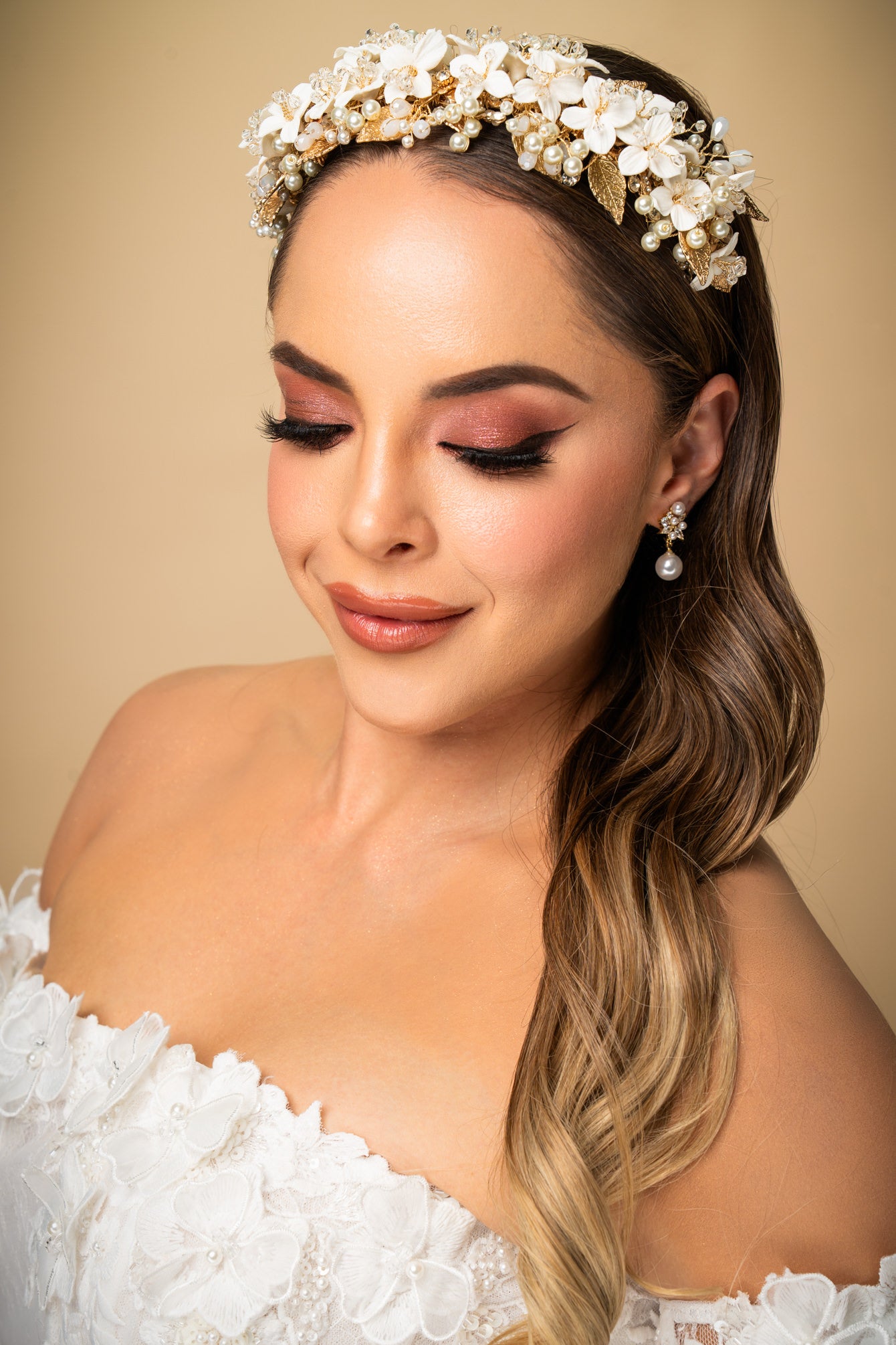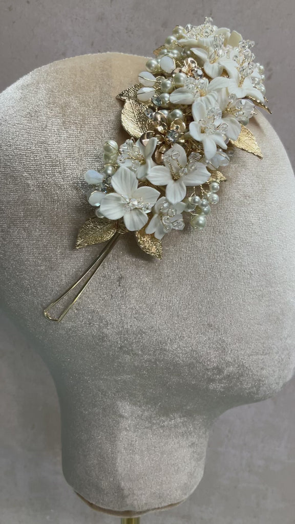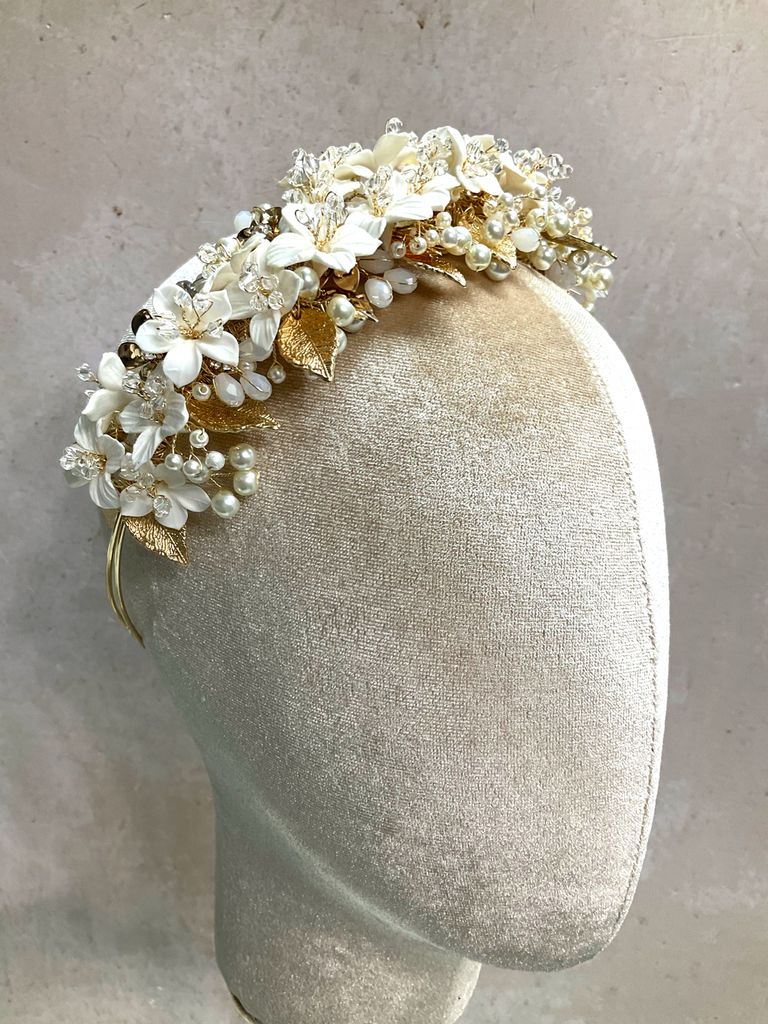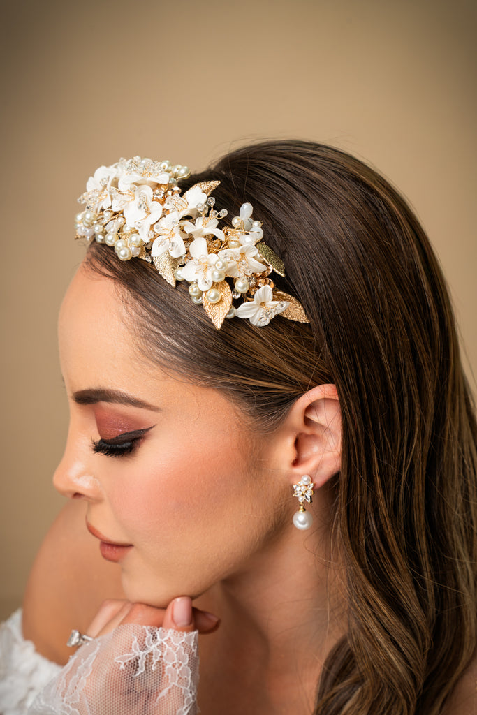 Una impresionante combinación de elegancia y romanticismo, la tiara BLOVED-91 está elaborada artesanalmente en flores de porcelana con hojas en gold, cristales austriacos y ópalos. Su delicado diseño brinda un look lleno de romanticismo.
