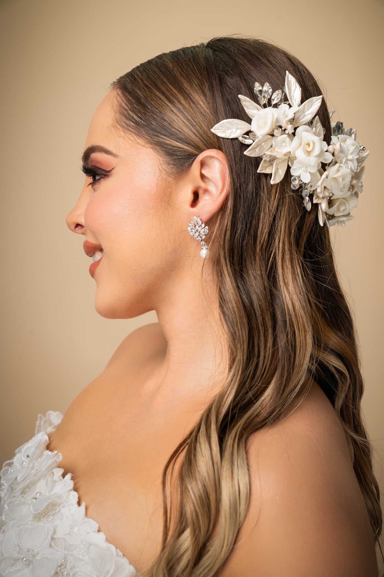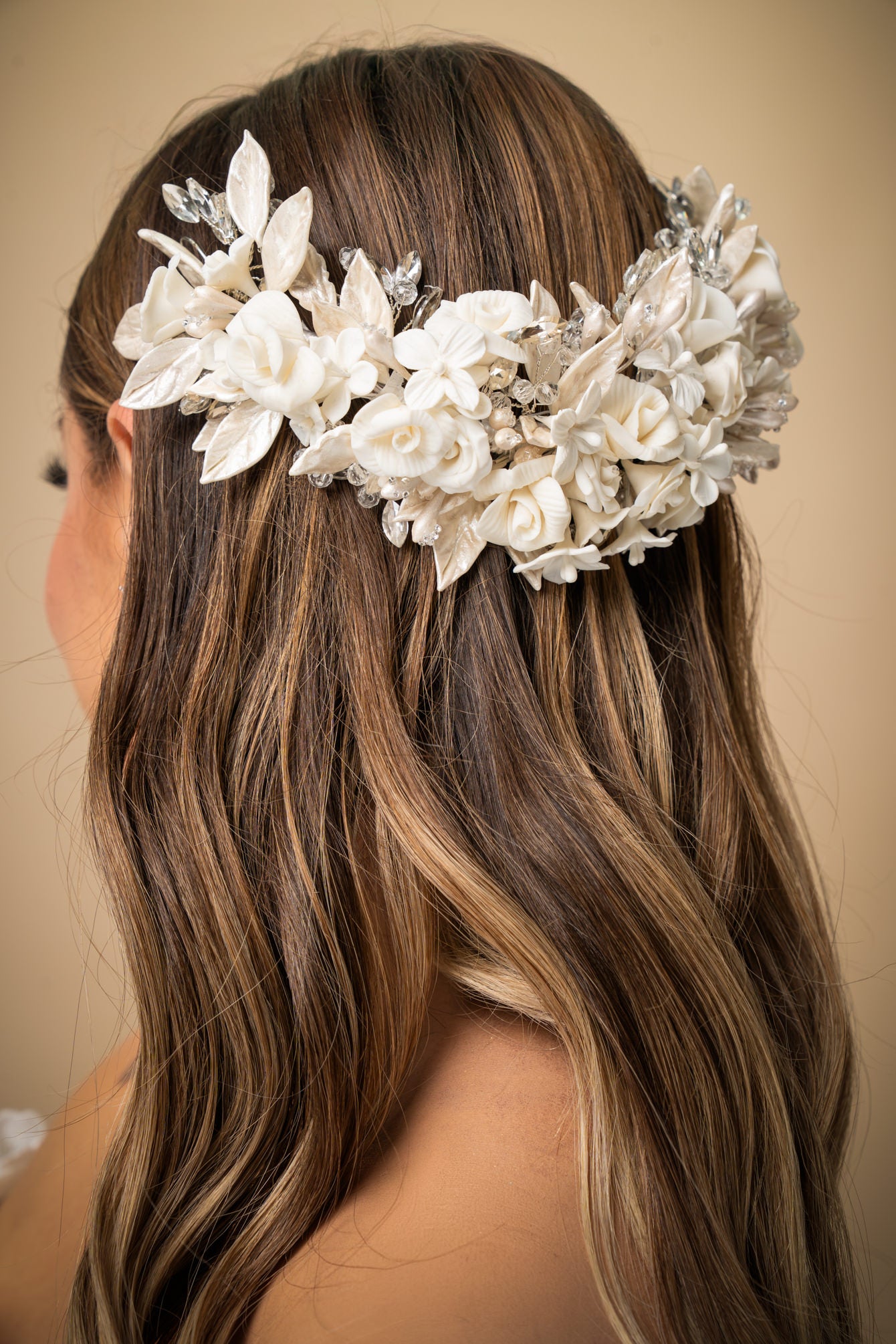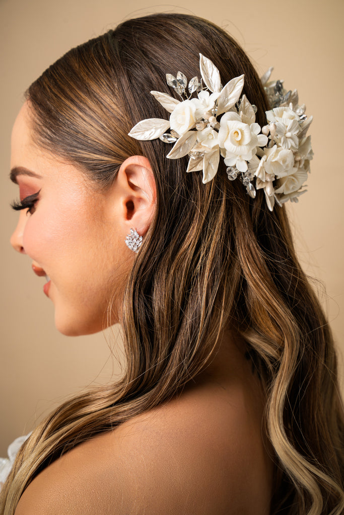 Tocado BLOVED-43 esta elaborado artesanalmente en pasta francesa con flores, cristales austriacos, y azahares con destellos en zirconias.