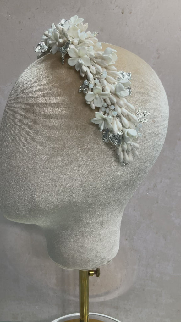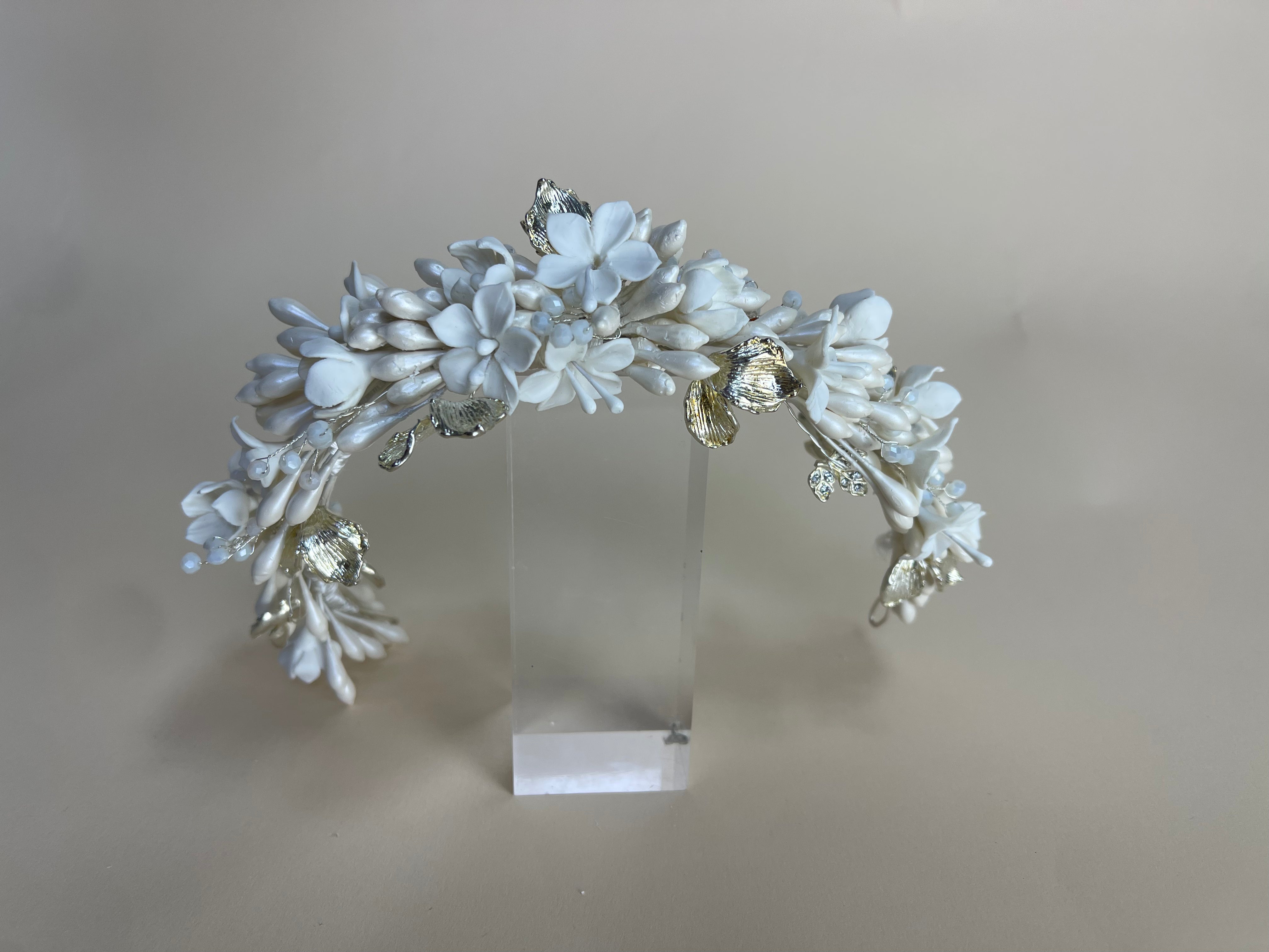 Diadema en azahares brinda un estilo único a las novias. Esta diadema está elaborada en azahares y flores de pasta francesa con incrustaciones de hoja silver y cristal ópalo.