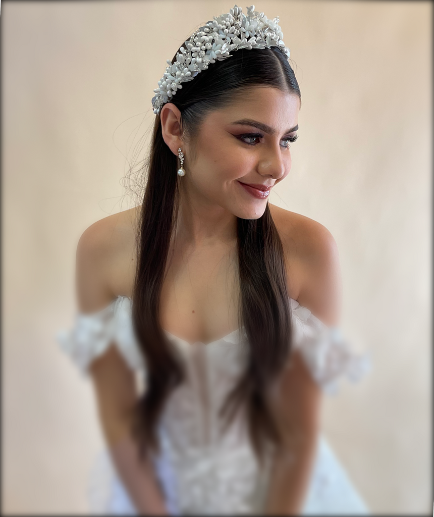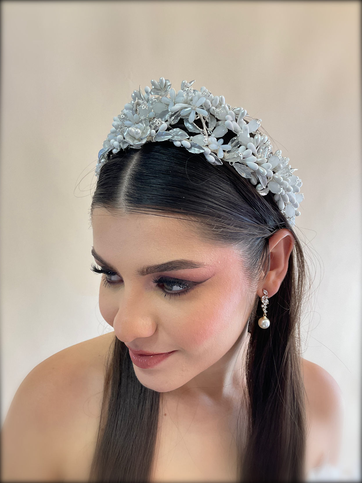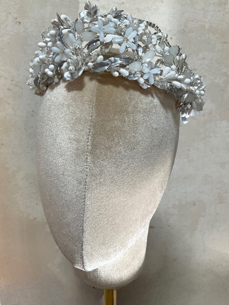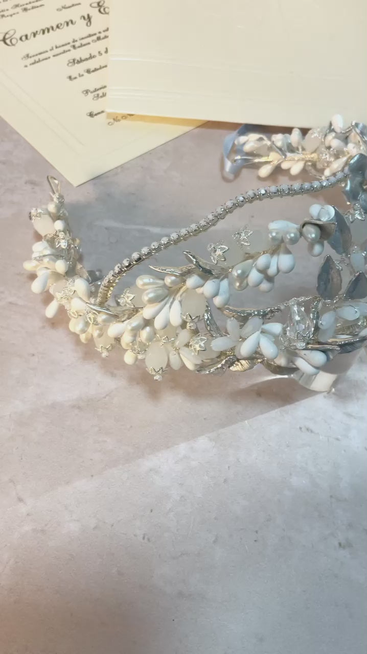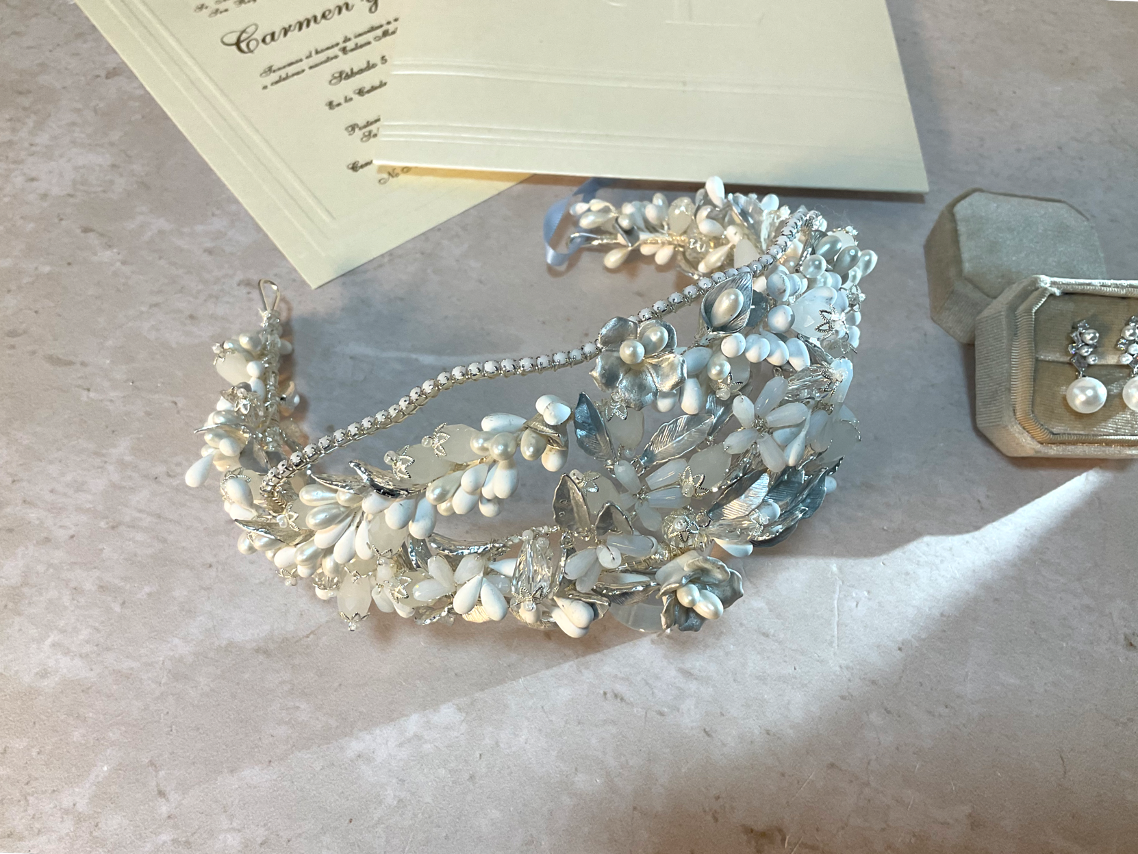 Esta espectacular tiara flexible elaborada en azahares con incrustaciones de cristales gota opal y hojas plata.