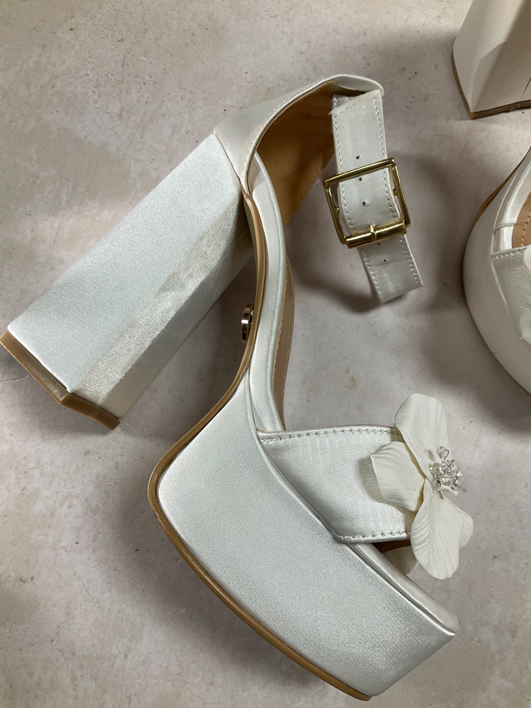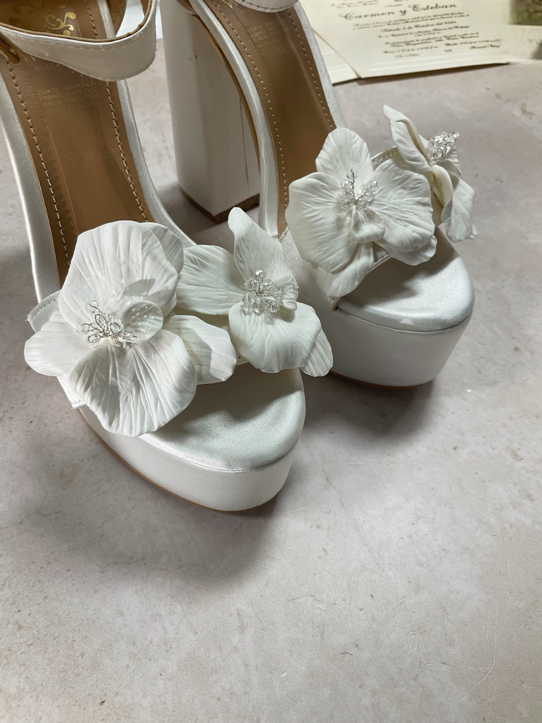 Hermosas zapatillas CAMILA, elaboradas en shantung satinado con decoración de orquídeas hechas a mano en porcelana francesa con el centro en cristal austriaco.